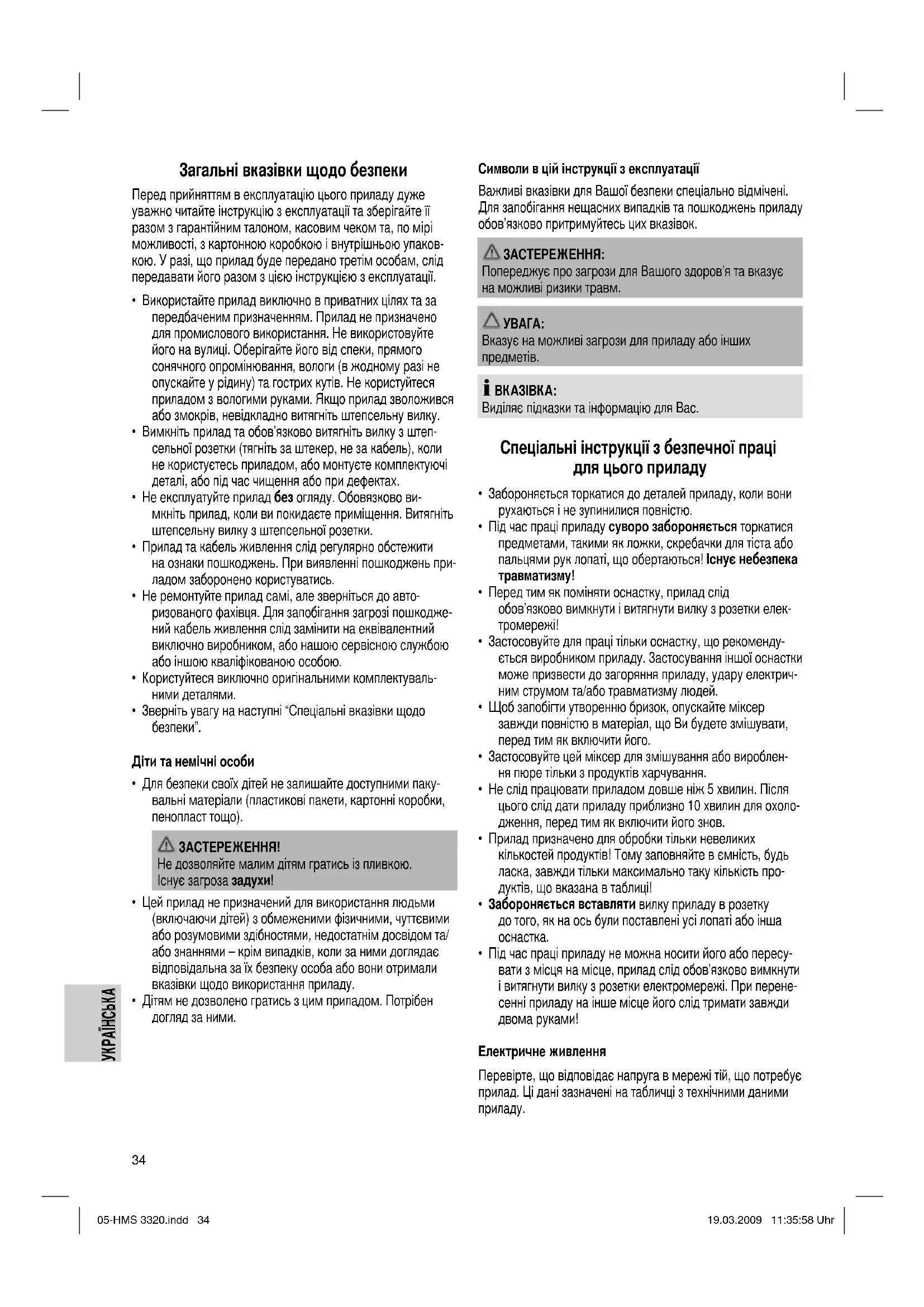 - Деталі приладу, що контактують з тістом, (крюки для вимішування тіста та ємність для продуктів) можна мити в воді з застосуванням миючих засобів. Технічні параметри Модель: ....................................................................... HMS 3320 Подання живлення: .................................................230 В, 50 Гц Споживання потужності: ...................................................220 Вт Ггрупа електробезпечності: ...................................................... ΙΙ Вага нетто: ........................................................................ 1,60 кг Цей прилад було перевірено згідно всіх відповідних, актуальних директив СЕ, наприклад щодо електромагнітної сумісності та низьковольтної директиви, та збудовано з а новітніми положеннями техніки безпеки. Залишаємо за собою право на технічні зміни! 05-HMS 3320.indd 3605-HMS 3320.indd 36 19.03.2009 11:35:59 Uhr19.03.2009 11:35:59 Uhr37