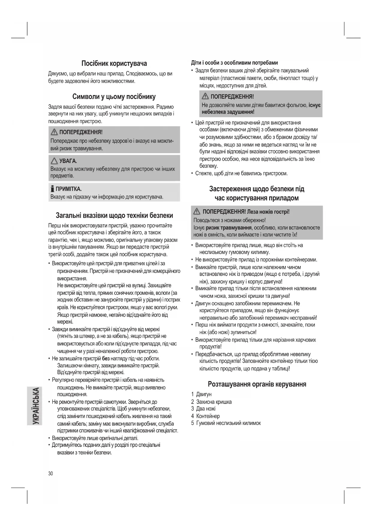 - Передбачається, що прилад оброблятиме невелику кількість продуктів! Заповнюйте контейнер тільки тією кількістю продуктів, що подана у таблиці! Розташування органів керування 1 Двигун 2 Захисна кришка 3 Два ножі 4 Контейнер 5 Гумовий неслизький килимок Посібник користувача Дякуємо, що вибрали наш прилад. Сподіваємось, що ви будете задоволені його можливостями. Символи у цьому посібнику Задля вашої безпеки подано чіткі застереження. Радимо звернути на них увагу, щоб уникнути нещасних випадків і пошкодження пристрою. ПОПЕРЕДЖЕННЯ! Попереджає про небезпеку здоров’ю і вказує на можли- вий ризик травмування.