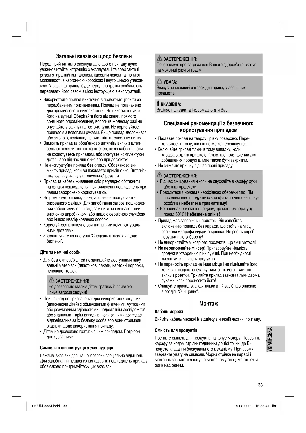 Кабель мережі Вийміть кабель мережі із відділку в нижній частині приладу. Ємність для продуктів Поставте ємність для продуктів на копус мотору. Поверніть карафу за ходом стрілки годинника до тієї точки, де Ви почуєте клацання блокувального механізму. При цьому звертайте увагу на символи. Чорна стрілка на карафі і малюнок закритого замку на моторному блоці мають бути один над одним. 05-UM 3334.indd 3305-UM 3334.indd 33 19.08.2009 16:55:41 Uhr19.08.2009 16:55:41 Uhr34