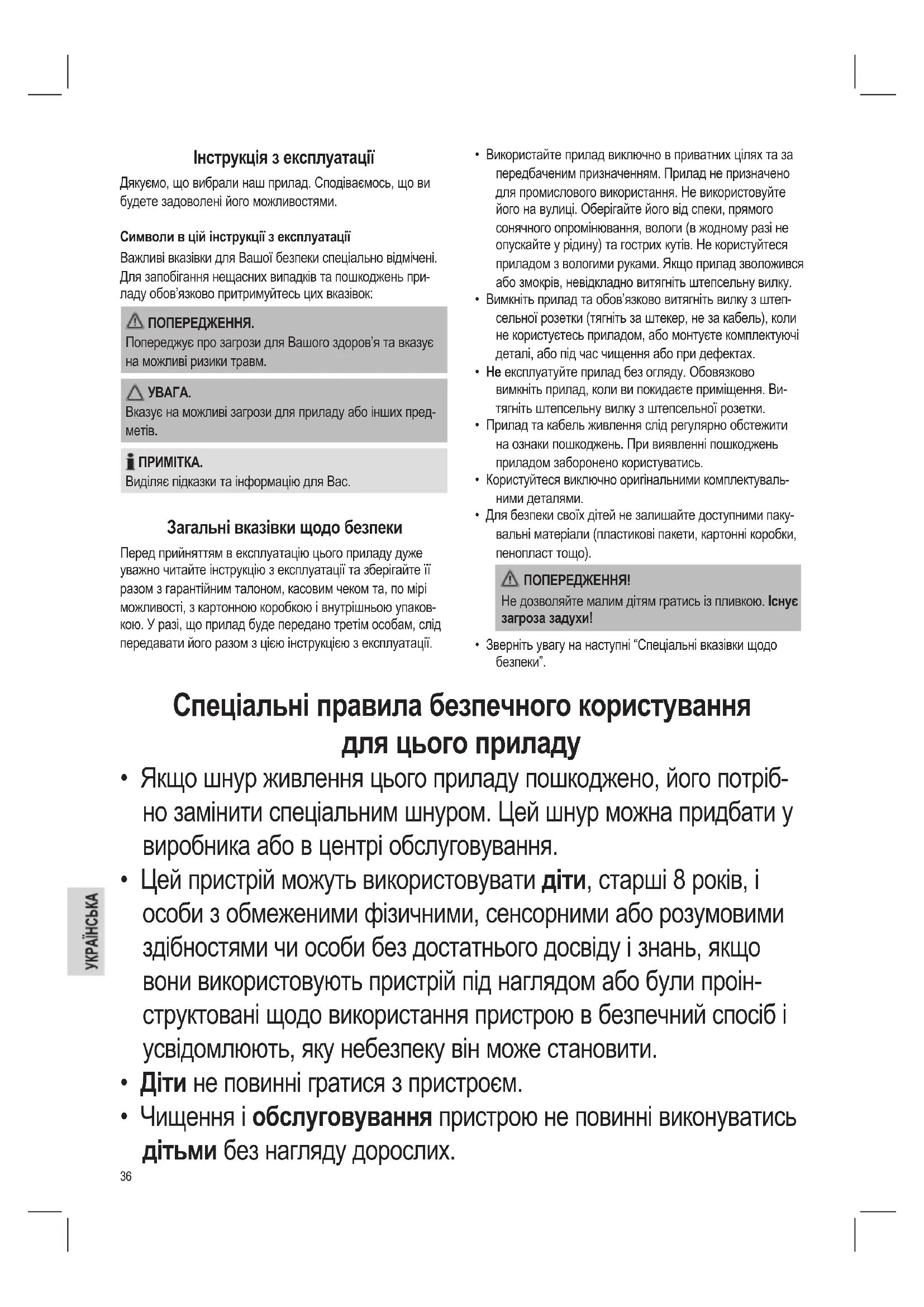 - Чищення і обслуговування пристрою не повинні виконуватись дітьми без нагляду дорослих.37