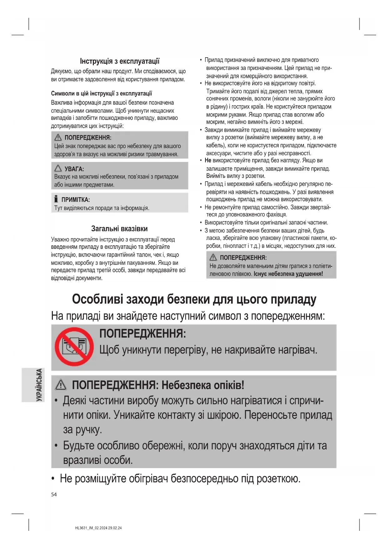 - Не розміщуйте обігрівач безпосередньо під розеткою.HL3631_IM_02.2024 29.02.24