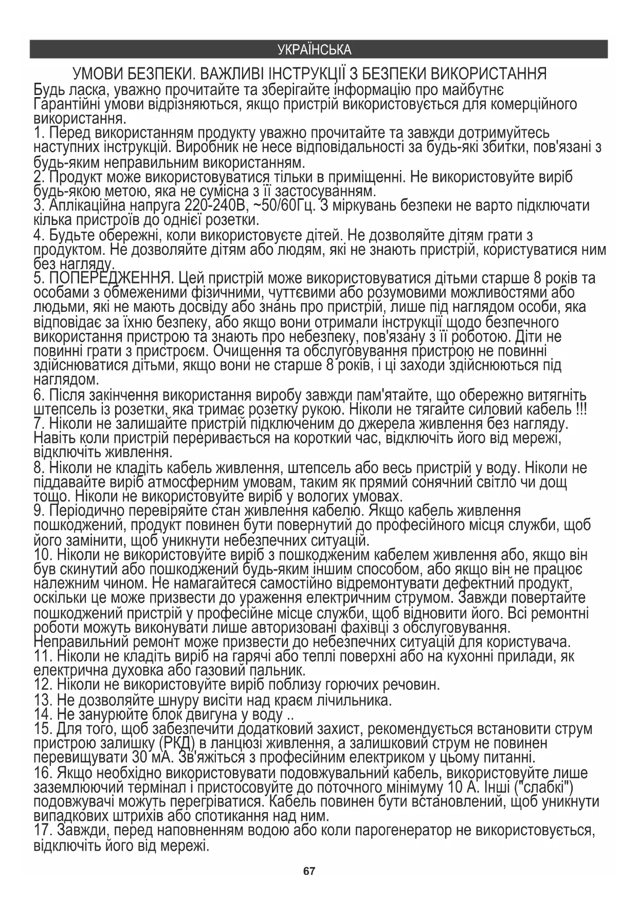 особами з обмеженими фізичними, чуттєвими або розумовими можливостями або людьми, які не мають досвіду або знань про пристрій, лише під наглядом особи, яка відповідає за їхню безпеку, або якщо вони отримали інструкції щодо безпечного використання пристрою та знають про небезпеку, пов'язану з її роботою. Діти не повинні грати з пристроєм. Очищення та обслуговування пристрою не повинні здійснюватися дітьми, якщо вони не старше 8 років, і ці заходи здійснюються під