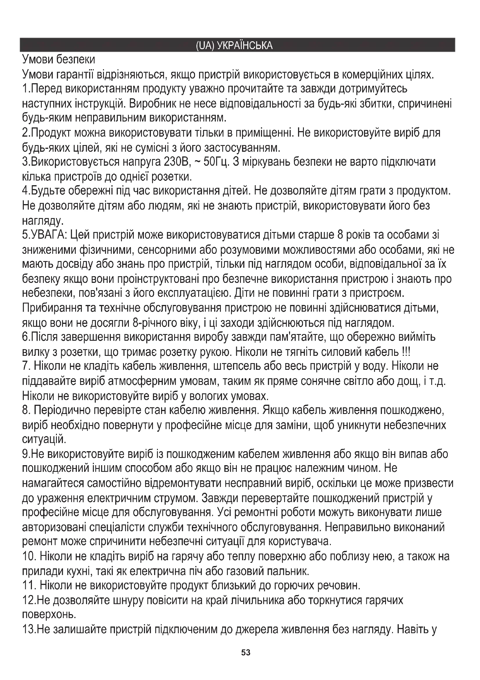 5.УВАГА: Цей пристрій може використовуватися дітьми старше 8 років та особами зі зниженими фізичними, сенсорними або розумовими можливостями або особами, які не мають досвіду або знань про пристрій, тільки під наглядом особи, відповідальної за їх безпеку якщо вони проінструктовані про безпечне використання пристрою і знають про небезпеки, пов'язані з його експлуатацією. Діти не повинні грати з пристроєм. Прибирання та технічне обслуговування пристрою не повинні здійснюватися дітьми, якщо вони не досягли 8-річного віку, і ці заходи здійснюються під наглядом. 6.Після завершення використання виробу завжди пам'ятайте, що обережно вийміть вилку з розетки, що тримає розетку рукою. Ніколи не тягніть силовий кабель !!!