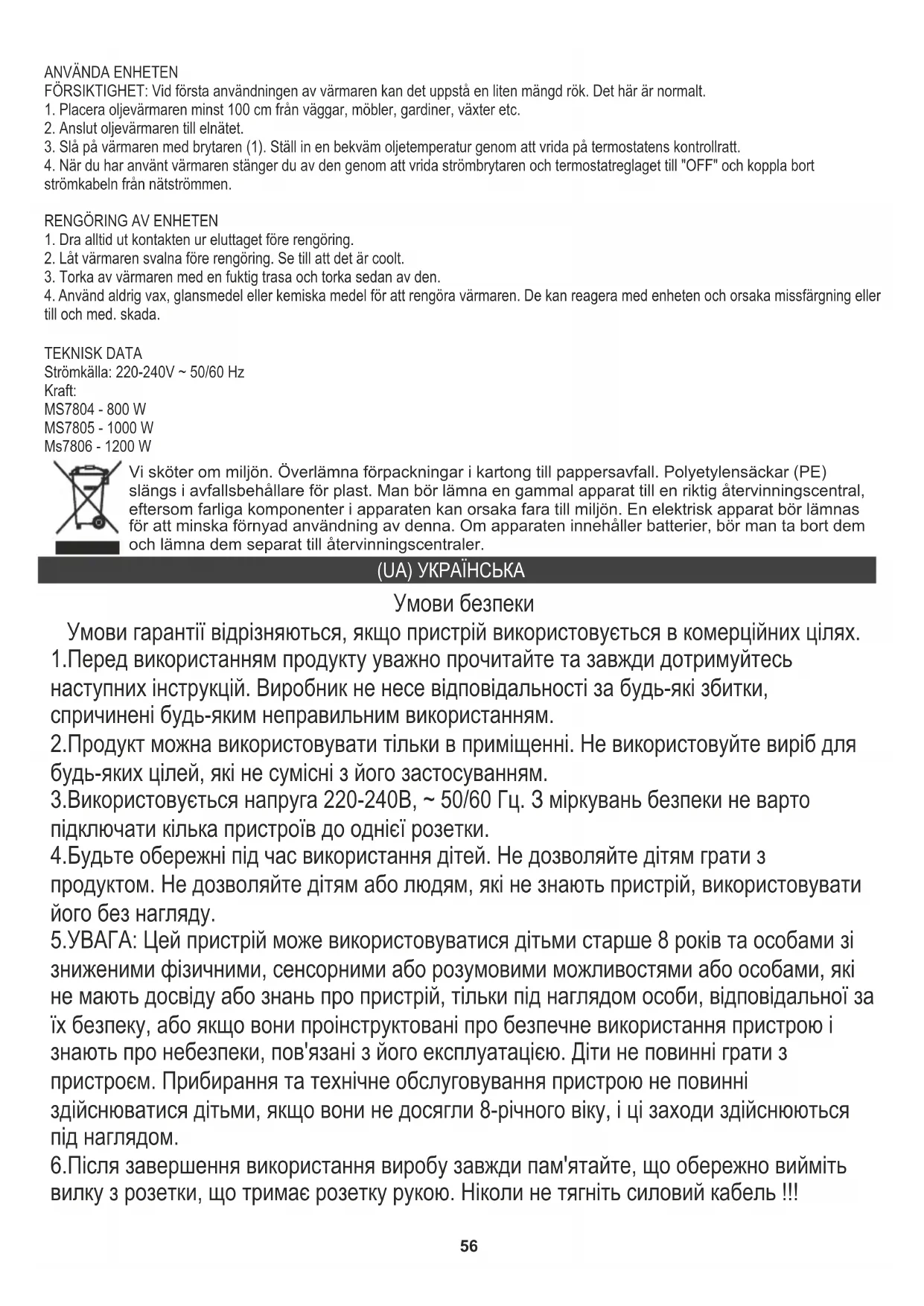 4. Ніколи не використовуйте воск, блискучі агенти або хімічні агенти для очищення нагрівача. Вони можуть реагувати з пристроєм і викликати знебарвлення або навіть пошкодження. ТЕХНІЧНІ ДАНІ Джерело живлення: 220-240В ~ 50/60 Гц Потужність: MS7804 - 800 Вт MS7805 - 1000 Вт MS7806 - 1200 Вт У інтересах навколишнього середовища. Будь ласка, віддайте картонну упаковку в місце збору мукулатури. Політиленові мішки (PE) викинути в смітник для пластику. Відпрацьований пристрій повинен бути відправлений у відповідну точку зберігання, тому що в пристрої є небезпечні інгредієнти, які можуть становити загрозу навколишньому середовищу. Електричний пристрій потрібно повернути так, щоб обмежити його повторне використання. Якщо у пристрої є батерейки, то потрібно їх витягнути і віддати до відповідного пунтку. (SK) SLOVENSKÝ BEZPEČNOSTNÉ PODMIENKY DÔLEŽITÉ POKYNY PRE BEZPEČNOSŤ POUŽITIA SI PREČÍTAJTE POZORNE A UCHOVÁVAJTE PRE BUDÚCNOSŤ59 Podmienky záruky sú odlišné, ak sa zariadenie používa na komerčné účely. 1.Pred použitím výrobku pozorne prečítajte a dodržujte nasledujúce pokyny. Výrobca nezodpovedá za žiadne škody spôsobené zneužitím. 2.Produkt sa má používať iba v interiéri. Nepoužívajte výrobok na žiadny účel, ktorý nie je kompatibilný s jeho aplikáciou.