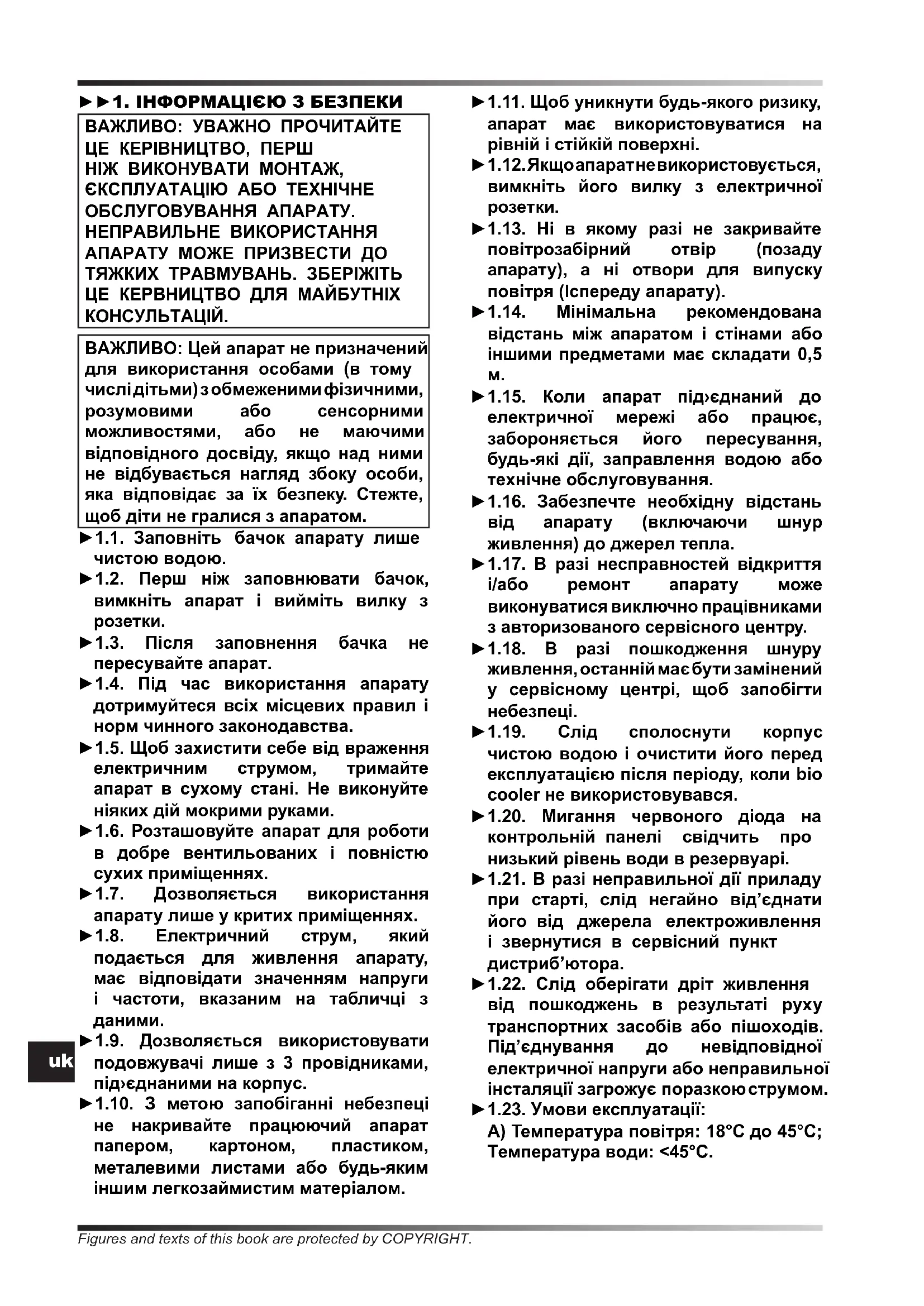 ►1.19. Слід сполоснути корпус чистою водою і очистити його перед експлуатацією після періоду, коли bio cooler не використовувався. ►1.20. Мигання червоного діода на контрольній панелі свідчить про низький рівень води в резервуарі. ►1.21. В разі неправильної дії приладу при старті, слід негайно від’єднати його від джерела електроживлення і звернутися в сервісний пункт дистриб’ютора. ►1.22. Слід оберігати дріт живлення від пошкоджень в результаті руху транспортних засобів або пішоходів. Під’єднування до невідповідної електричної напруги або неправильної інсталяції загрожує поразкою струмом. ►1.23. Умови експлуатації: A) Температура повітря: 18°C до 45°C; Температура води: <45°C. Figures and texts of this book are protected by COPYRIGHT.uk B) Напруга в джерелі живлення не може перевищувати необхідної напруги на (+/-) 5%. C) Приплив повітря має бути вільним від пилу, забруднень, а у разі потреби слід виконати додаткове очищення. ►►2. РОЗПАКУВАННЯ ►2.1. Вийміть всі пакувальні матеріали, використовувані для упаковки і транспортування апарату, і утилізуйте їх відповідного до норм чинного законодавства. ►2.2. Вийміть всі компоненти з упаковки. ►2.3. Переконайтеся у відсутності ушкоджень, які сталися з апаратом внаслідок транспортування. Якщо апарат пошкоджений, негайно проінформуйте магазин, де апарат був придбаний. ►►3. МОНТАЖ Апарат оснащений коліщатками для полегшення його пересування. Залежно від моделі, коліщатка можуть бути вже встановлені або їх необхідно встановити додатково. Компоненти разом з відповідними гвинтами і іншими кріпильними елементами, знаходяться всередині упаковки (Мал. 1). ►►4. ЕКСПЛУАТАЦІЯ УВАГА: Ознайомтеся з “ІНФОРМАЦІЄЮ З БЕЗПЕКИ”, перш ніж увімкнути