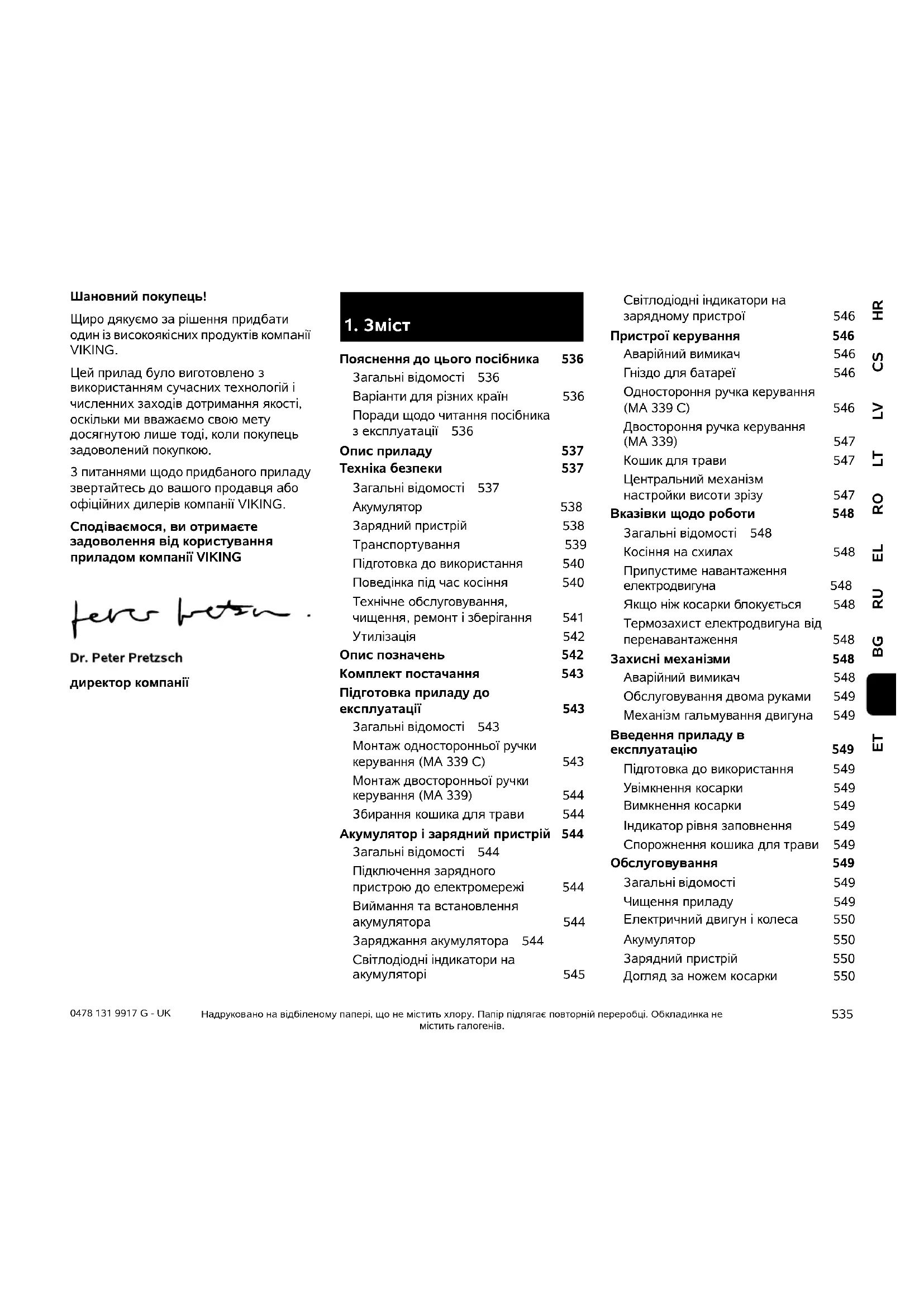 Пояснення до цього посібника 536 Загальні відомості 536 Варіанти для різних країн 536 Поради щодо читання посібника з експлуатації 536 Опис приладу 537 Техніка безпеки 537 Загальні відомості 537 Акумулятор 538 Зарядний пристрій 538 Транспортування 539 Підготовка до використання 540 Поведінка під час косіння 540 Технічне обслуговування, чищення, ремонт і зберігання 541 Утилізація 542 Опис позначень 542 Комплект постачання 543 Підготовка приладу до експлуатації 543 Загальні відомості 543 Монтаж односторонньої ручки керування (MА 339 C) 543 Монтаж двосторонньої ручки керування (MА 339) 544 Збирання кошика для трави 544 Акумулятор і зарядний пристрій 544 Загальні відомості 544 Підключення зарядного пристрою до електромережі 544 Виймання та встановлення акумулятора 544 Заряджання акумулятора 544 Світлодіодні індикатори на акумуляторі 545 Світлодіодні індикатори на зарядному пристрої 546 Пристрої керування 546 Аварійний вимикач 546 Гніздо для батареї 546 Одностороння ручка керування (MА 339 C) 546 Двостороння ручка керування (MА 339) 547 Кошик для трави 547 Центральний механізм настройки висоти зрізу 547 Вказівки щодо роботи 548 Загальні відомості 548 Косіння на схилах 548 Припустиме навантаження електродвигуна 548 Якщо ніж косарки блокується 548 Термозахист електродвигуна від перенавантаження 548 Захисні механізми 548 Аварійний вимикач 548 Обслуговування двома руками 549 Механізм гальмування двигуна 549 Введення приладу в експлуатацію 549 Підготовка до використання 549 Увімкнення косарки 549 Вимкнення косарки 549 Індикатор рівня заповнення 549 Спорожнення кошика для трави 549 Обслуговування 549 Загальні відомості 549 Чищення приладу 549 Електричний двигун і колеса 550 Акумулятор 550 Зарядний пристрій 550 Догляд за ножем косарки 5500478 131 9917 G - UK