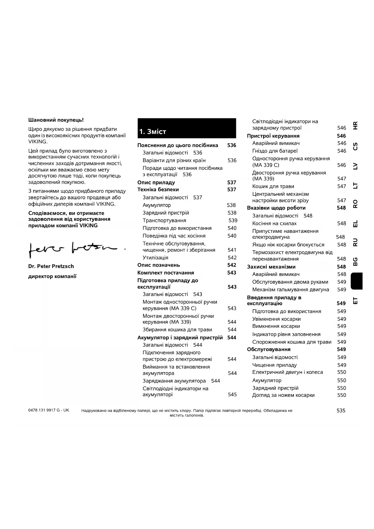 Пояснення до цього посібника 536 Загальні відомості 536 Варіанти для різних країн 536 Поради щодо читання посібника з експлуатації 536 Опис приладу 537 Техніка безпеки 537 Загальні відомості 537 Акумулятор 538 Зарядний пристрій 538 Транспортування 539 Підготовка до використання 540 Поведінка під час косіння 540 Технічне обслуговування, чищення, ремонт і зберігання 541 Утилізація 542 Опис позначень 542 Комплект постачання 543 Підготовка приладу до експлуатації 543 Загальні відомості 543 Монтаж односторонньої ручки керування (MА 339 C) 543 Монтаж двосторонньої ручки керування (MА 339) 544 Збирання кошика для трави 544 Акумулятор і зарядний пристрій 544 Загальні відомості 544 Підключення зарядного пристрою до електромережі 544 Виймання та встановлення акумулятора 544 Заряджання акумулятора 544 Світлодіодні індикатори на акумуляторі 545 Світлодіодні індикатори на зарядному пристрої 546 Пристрої керування 546 Аварійний вимикач 546 Гніздо для батареї 546 Одностороння ручка керування (MА 339 C) 546 Двостороння ручка керування (MА 339) 547 Кошик для трави 547 Центральний механізм настройки висоти зрізу 547 Вказівки щодо роботи 548 Загальні відомості 548 Косіння на схилах 548 Припустиме навантаження електродвигуна 548 Якщо ніж косарки блокується 548 Термозахист електродвигуна від перенавантаження 548 Захисні механізми 548 Аварійний вимикач 548 Обслуговування двома руками 549 Механізм гальмування двигуна 549 Введення приладу в експлуатацію 549 Підготовка до використання 549 Увімкнення косарки 549 Вимкнення косарки 549 Індикатор рівня заповнення 549 Спорожнення кошика для трави 549 Обслуговування 549 Загальні відомості 549 Чищення приладу 549 Електричний двигун і колеса 550 Акумулятор 550 Зарядний пристрій 550 Догляд за ножем косарки 5500478 131 9917 G - UK