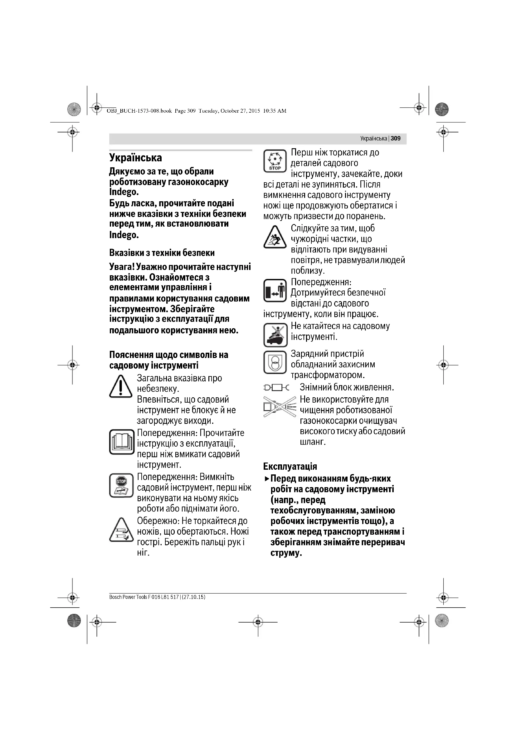 Серійний номер див. заводську табличку на садовому інструменті *у залежності від типу інструменту **у залежності від форми і складності поверхні газону (див. Приклади на мал. 3) ***у залежності від висоти скошування, умов росту трави і вологи Параметри зазначені для номінальної напруги [U] 230 В. При інших значенн ях напруги, а також у специфічному для країни виконанні можливі інші параметри. OBJ_BUCH-1573-008.book Page 314 Tuesday, October 27, 2015 10:35 AMУкраїнська | 315 Bosch Power Tools F 016 L81 517 | (27.10.15) Акумуляторна