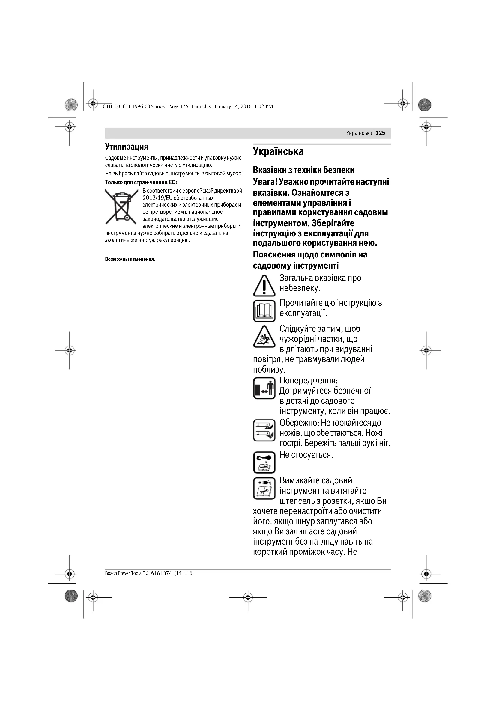 Попередження: Дотримуйтеся безпечної відстані до садового інструменту, коли він працює. Обережно: Не торкайтеся до ножів, що обертаються. Ножі гострі. Бережіть пальці рук і ніг. Не стосується. Вимикайте садовий інструмент та витягайте штепсель з розетки, якщо Ви хочете перенастроїти або очистити його, якщо шнур заплутався або якщо Ви залишаєте садовий інструмент без нагляду навіть на короткий проміжок часу. Не OBJ_BUCH-1996-005.book Page 125 Thursday, January 14, 2016 1:02 PM126 | Українська F 016 L81 374 | (14.1.16) Bosch Power Tools допускайте потрапляння шнура живлення під ножі. Перш ніж торкатися до деталей садового інструменту, зачекайте, доки всі деталі не зупиняться. Після вимкнення садового інструменту ножі ще продовжують обертатися і можуть призвести до поранень. Не користуйтеся садовим інструментом в дощ, на прилад взагалі не повинен попадати дощ. Захищайте себе від удару електричним струмом. Не допускайте потрапляння шнура живлення під ножі. Експлуатація Ні в якому разі не дозволяйте користуватися садовим інструментом дітям і особам, що не знайомі з цими вказівками. Національні приписи можуть обмежувати допустимий вік користувача. Якщо Ви не працюєте з садовим інструментом, зберігайте його в недоступному для дітей місці. Цей садовий інструмент не призначений для використання особами (включаючи дітей) з обмеженими психічними, чуттєвими або розумовими здатностями або недостатнім досвідом та/або недостатніми знаннями – це дозволяється робити лише у тому випадку, якщо за ними спостерігає особа, що відповідає за їхню безпеку, або вони отримують від неї вказівки щодо того, як слід використовувати