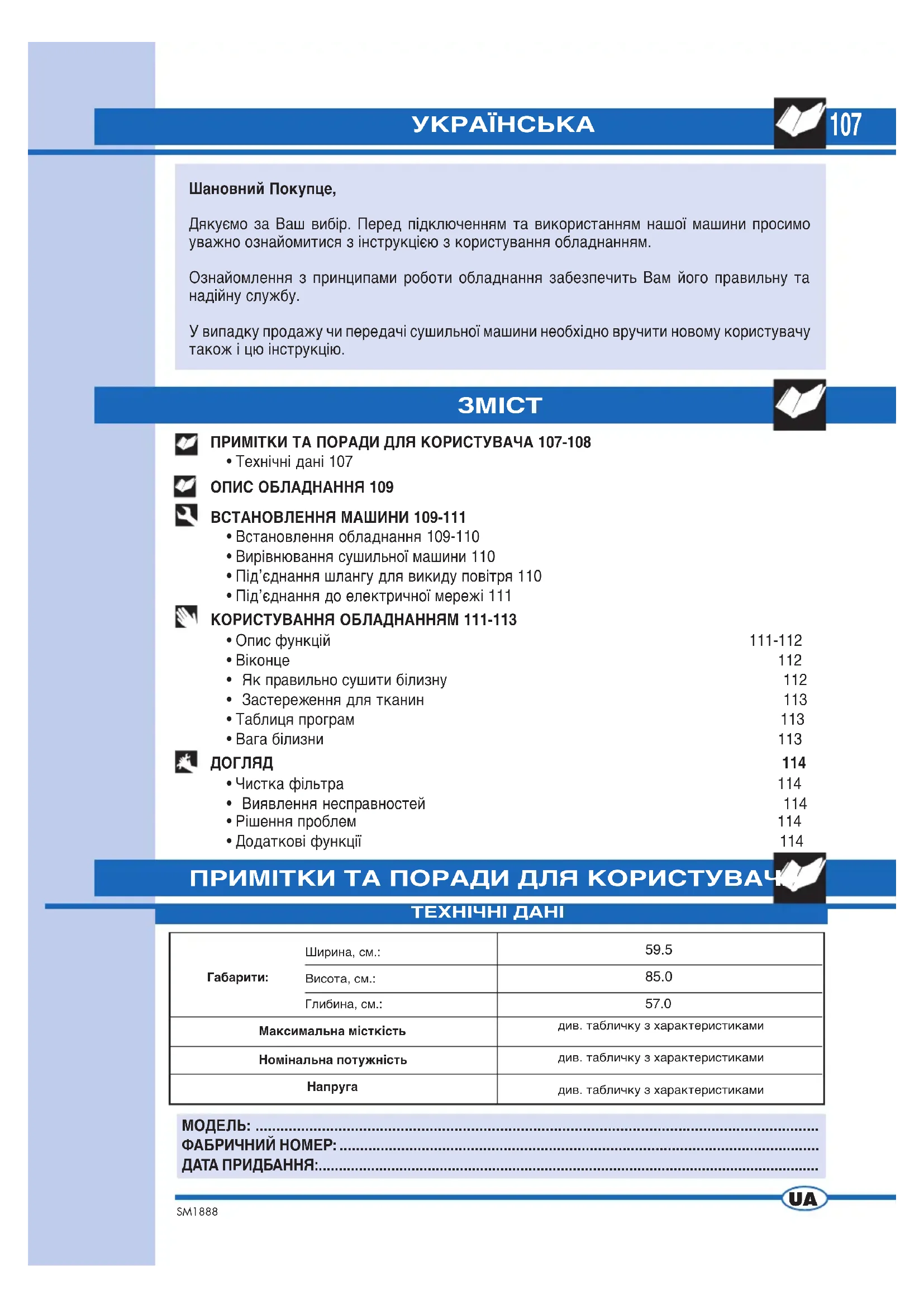 - Додаткові функції 114108 SM1888 ПРИМІТКИ ТА ПОРАДИ ДЛЯ КОРИСТУВАЧА ▼ Дане обладнання повинно використовуватися як побутова сушильна машина. Будь-яке інше його застосування вважається неправильним,а тому небезпечним. ▼ Зберігайте дану інструкцію завжди поряд з сушильною машиною, щоб у випадку необхідності можна було швидко її проконсультувати. ▼ Будь-яка зміна чи спроба порушення цілісності обладнання може бути небезпечною для користувача, а також може пошкодити машину. ▼ На час одержання електроприладу вдома перевірте, чи він вільний від можливих пошкоджень, нанесених під час його перевезення. Якщо пошкодження наявні, Ви повинні негайно звернутися до продавця обладнання. ▼ Під час циклу сушіння повітря кімнати виводиться через задню частину електроприладу. Не накривайте сушильну машину білизною чи іншими речами. ▼ Під час розміщення обладнання запевніться, що електричний шнур не був зігнутий чи затиснутий, а також є легко доступним для можливого технічного втручання. ▼ Пам’ятайте, що під час циклу сушіння скло віконця та вивідний шланг можуть нагріватися до температури 60°. Не торкайтеся цих частин до кінця циклу охолодження. ▼ Забороняється користуватися приладом дітям за відсутності дорослих. ▼ Ніколи не сушіть одяг чи тканини, які перебували в контакті з хімічними розчинами, такими як, наприклад, розчинники для сухої чистки. Ці летучі речовини можуть спричинитися до вибухів. ▼ Не сушіть одяг зі вмістом резини чи частин з резини, оскільки вони можуть розплавитися і пошкодити інший одяг або навіть сам електроприлад. ▼ Якщо Ви продаєте або даруєте цей електроприлад, пам’ятайте, що разом з обладнанням необхідно передати і цю інструкцію, яка допоможе наступному власнику користуватися сушильною машиною правильно