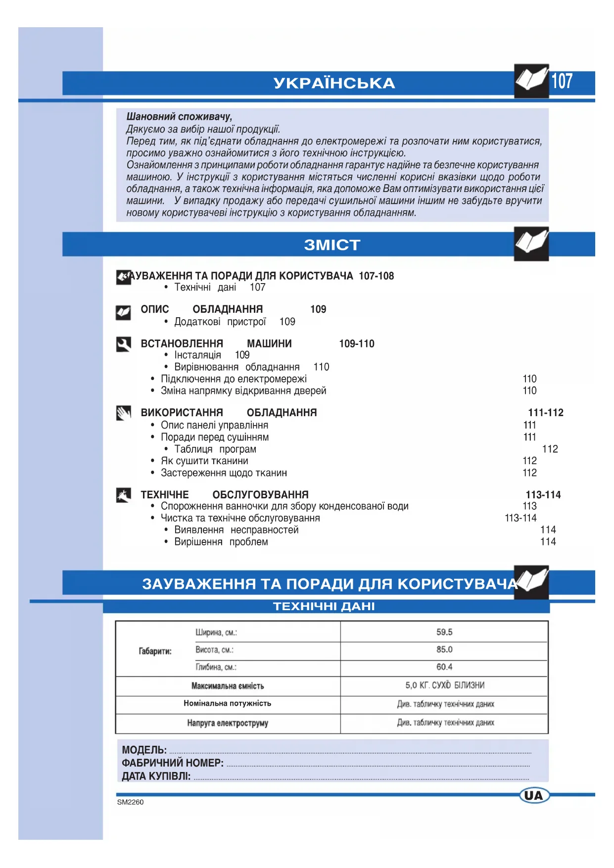 - Вирішення проблем 114108 SM2260 ЗАУВАЖЕННЯ ТА ПОРАДИ ДЛЯ КОРИСТУВАЧА ▼ Це обладнання є сушильною машиною для домашнього користування; будь-яке інше застосування обладнання повинно вважатися невластивим, а отже небезпечним. ▼ Зберігайте дану інструкцію завжди поряд з сушильним обладнанням, щоб у випадку потреби її можна було швидко проконсультувати. ▼ Будь-які зміни або спроба пошкодити обладнання можуть бути небезпечними для користувача і шкідливими для самого обладнання. ▼ У момент поставки електроприладу запевніться, щоб він не був пошкоджений під час перевезення. У випадку можливих пошкоджень негайно зверніться до продавця. ▼ Не вкривайте сушильну машину білизною чи іншими предметами. ▼ Під час розміщення обладнання запевніться, що електрошнур не був зігнутий чи придавлений, а також щоб він був легко доступний для здійснення можливого технічного втручання. ▼ Завжди закривайте дверцята після використання електроприладу. ▼ Таким чином Ви перешкодите дітям опиратися до дверцят і перекидати сушильну машину. ▼ Забороняється користуватися обладнанням дітям, якщо вони не перебувають під наглядом. ▼ Не сушити в сушильній машині брудний одяг. ▼ Ніколи не сушити одягу, який був забруднений такими розчинами як харчова олія, нафта, ацетон, алкоголь, бензин, керосин, рідини для очищення плям, терпентин, віск. ▼ Перед тим, як завантажити подібну білизну в сушильну машину, усунути ці речовини за допомогою прання у гарячій воді з додаванням певної кількості прального розчину. ▼ Не сушити в машині виробів з губчатої резини, каучукового латексу, водонепроникних виробів, тканин, що не пропускають воду, резинових килимків, виробів чи одягу, а також подушок з каучукового латексу, оскільки вони можуть розплавитися і пошкодити іншу білизну і сам електропобутовий прилад. ▼ Пом’якшувальні розчини для тканин або подібні їм речовини повинні вживатися згідно інструкцій, які знаходяться у їх упаковці. ▼ Якщо побутовий електроприлад продається або переходить у користування інших людей, пам’ятайте про те, що разом з ним потрібно передати також і дану технічну інструкцію, яка допоможе наступному власнику користуватися сушильною машиною правильно і надійно. ▼ Не намагайтеся самостійно усунути несправності на обладнанні, тому що ремонт, виконаний неспеціалістами, може спричинитися до серйозних пошкоджень і позбавляє права на гарантійний