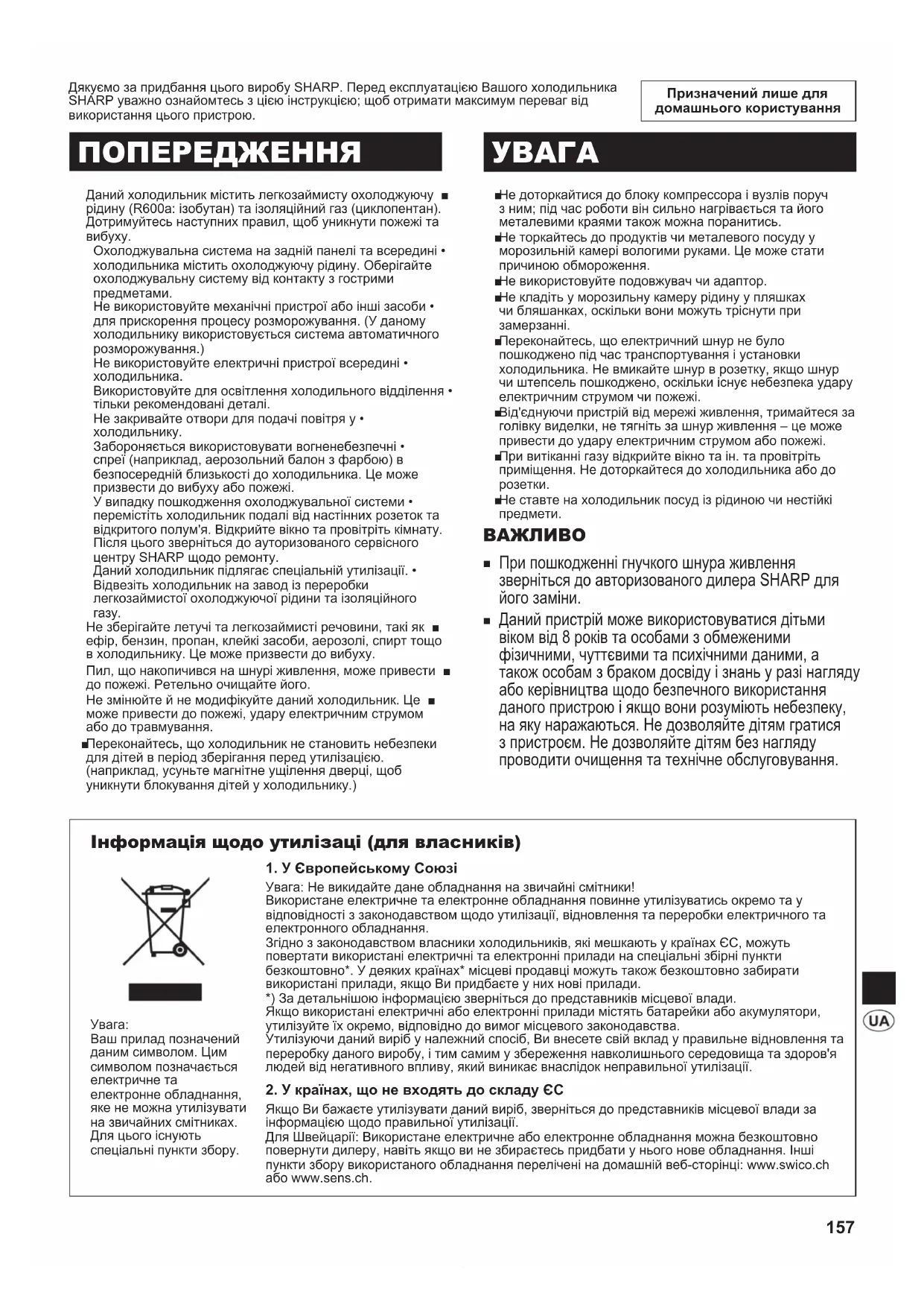 Охолоджувальна система на задній панелі та всередині • холодильника містить охолоджуючу рідину. Оберігайте охолоджувальну систему від контакту з гострими предметами. Не використовуйте механічні пристрої або інші засоби • для прискорення процесу розморожування. (У даному холодильнику використовується система автоматичного розморожування.) Не використовуйте електричні пристрої всередині • холодильника. Використовуйте для освітлення холодильного відділення • тільки рекомендовані деталі. Не закривайте отвори для подачі повітря у • холодильнику. Забороняється використовувати вогненебезпечні • спреї (наприклад, аерозольний балон з фарбою) в безпосередній близькості до холодильника. Це може призвести до вибуху або пожежі. У випадку пошкодження охолоджувальної системи • перемістіть холодильник подалі від настінних розеток та відкритого полум'я. Відкрийте вікно та провітріть кімнату. Після цього зверніться до ауторизованого сервісного центру SHARP щодо ремонту. Даний холодильник підлягає спеціальній утилізації. • Відвезіть холодильник на завод із переробки легкозаймистої охолоджуючої рідини та ізоляційного