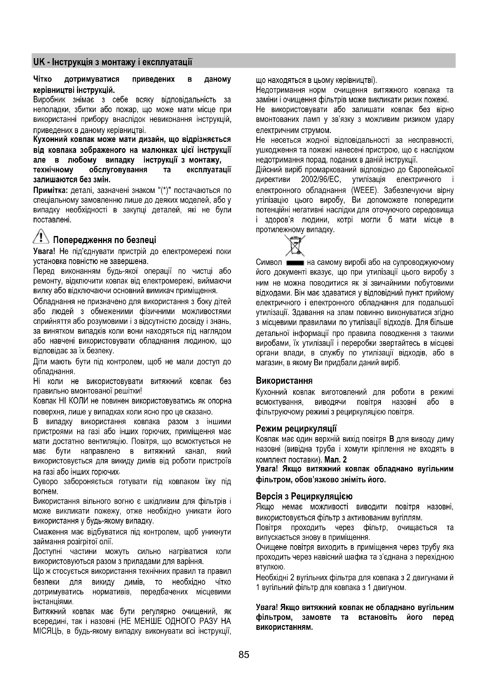 Використання вільного вогню є шкідливим для фільтрів і може викликати пожежу, отже необхідно уникати його використання у будь-якому випадку. Смаження має відбуватися під контролем, щоб уникнути займання розігрітої олії. Доступні частини можуть сильно нагріватися коли використовуються разом з приладами для варіння. Що ж стосується використання технічних правил та правил безпеки для викиду димів, то необхідно чітко дотримуватись нормативів, передбачених місцевими інстанціями. Витяжний ковпак має бути регулярно очищений, як всередині, так і назовні (НЕ МЕНШЕ ОДНОГО РАЗУ НА МІСЯЦЬ, в будь-якому випадку виконувати всі інструкції, що находяться в цьому керівництві). Недотримання норм очищення витяжного ковпака та заміни і очищення фільтрів може викликати ризик пожежі. Не використовувати або залишати ковпак без вірно вмонтованих ламп у зв’язку з можливим ризиком удару електричним струмом. Не несеться жодної відповідальності за несправності , ушкодження та пожежі нанесені пристрою, що є наслідком недотримання порад, поданих в даній інструкції. Дійсний виріб промаркований відповідно до Європейської директиви 2002/96/EC, утилізація електричного і електронного обладнання (WEEE). Забезпечуючи вірну утілізацію цього виробу, Ви допоможете попередити потенційні негативні наслідки для оточуючого середовища і здоров’я людини, котрі могли б мати місце в протилежному випадку.