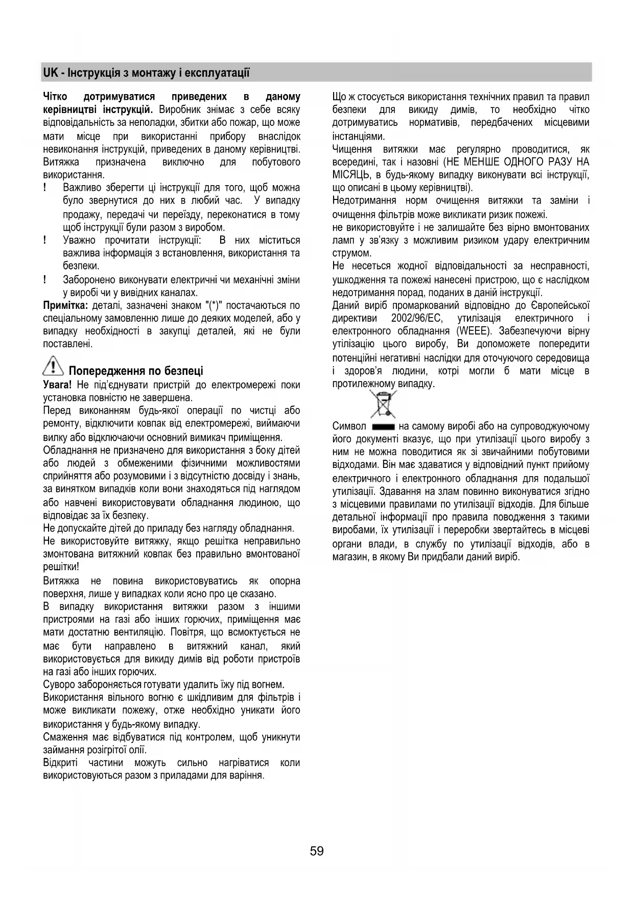 лише у випадках коли ясно про це сказано. В випадку використання витяжки разом з іншими пристроями на газі або інших горючих, приміщення має мати достатню вентиляцію. Повітря, що всмоктується не має бути направлено в витяжний канал, який використовується для викиду димів від роботи пристроїв на газі або інших горючих. Суворо забороняється готувати удалить їжу під вогнем. Використання вільного вогню є шкідливим для фільтрів і може викликати пожежу, отже необхідно уникати його використання у будь-якому випадку. Смаження має відбуватися під контролем, щоб уникнути займання розігрітої олії. Відкриті частини можуть сильно нагріватися коли використовуються разом з приладами для варіння. Що ж стосується використання технічних правил та правил безпеки для викиду димів, то необхідно чітко дотримуватись нормативів, передбачених місцевими інстанціями. Чищення витяжки має регулярно проводитися, як всередині, так і назовні (НЕ МЕНШЕ ОДНОГО РАЗУ НА МІСЯЦЬ, в будь-якому випадку виконувати всі інструкції, що описані в цьому керівництві). Недотримання норм очищення витяжки та заміни