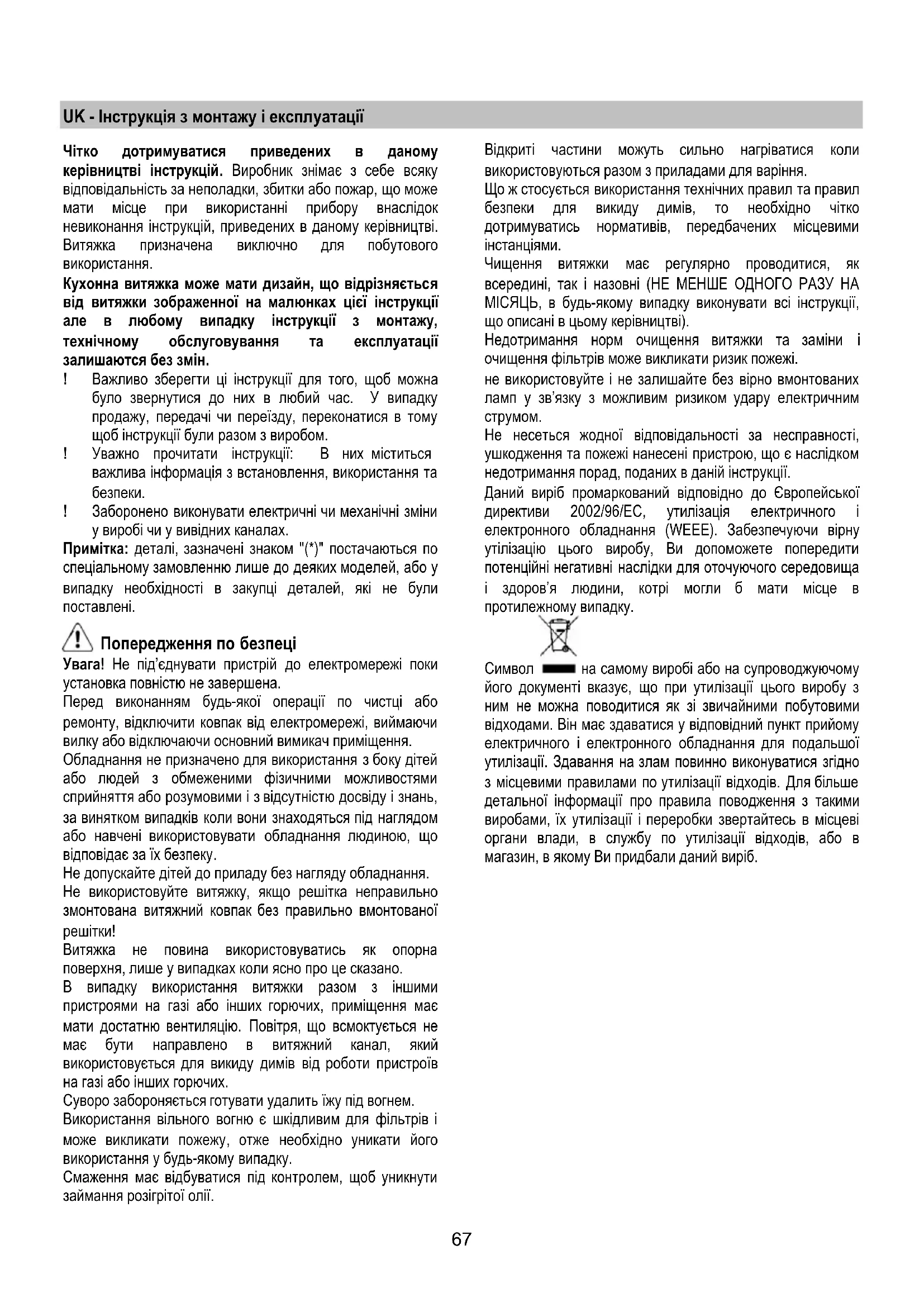 - Novo žarnico ponovno namestite tako, da postopate v obratnem zaporedju. Če luč ne bi delovala, preverite pravilno vstavitev žarnic v njihovo ležišče, preden se po pomoč obrnete na servisno službo.67 UK - Інструкція з монтажу і експлуатації Чітко дотримуватися приведених в даному керівництві інструкцій. Виробник знімає з себе всяку відповідальність за неполадки, збитки або пожар, що може мати місце при використанні прибору внаслідок невиконання інструкцій, приведених в даному керівництві. Витяжка призначена виключно для побутового використання. Кухонна витяжка може мати дизайн, що відрізняється від витяжки зображенної на малюнках цієї