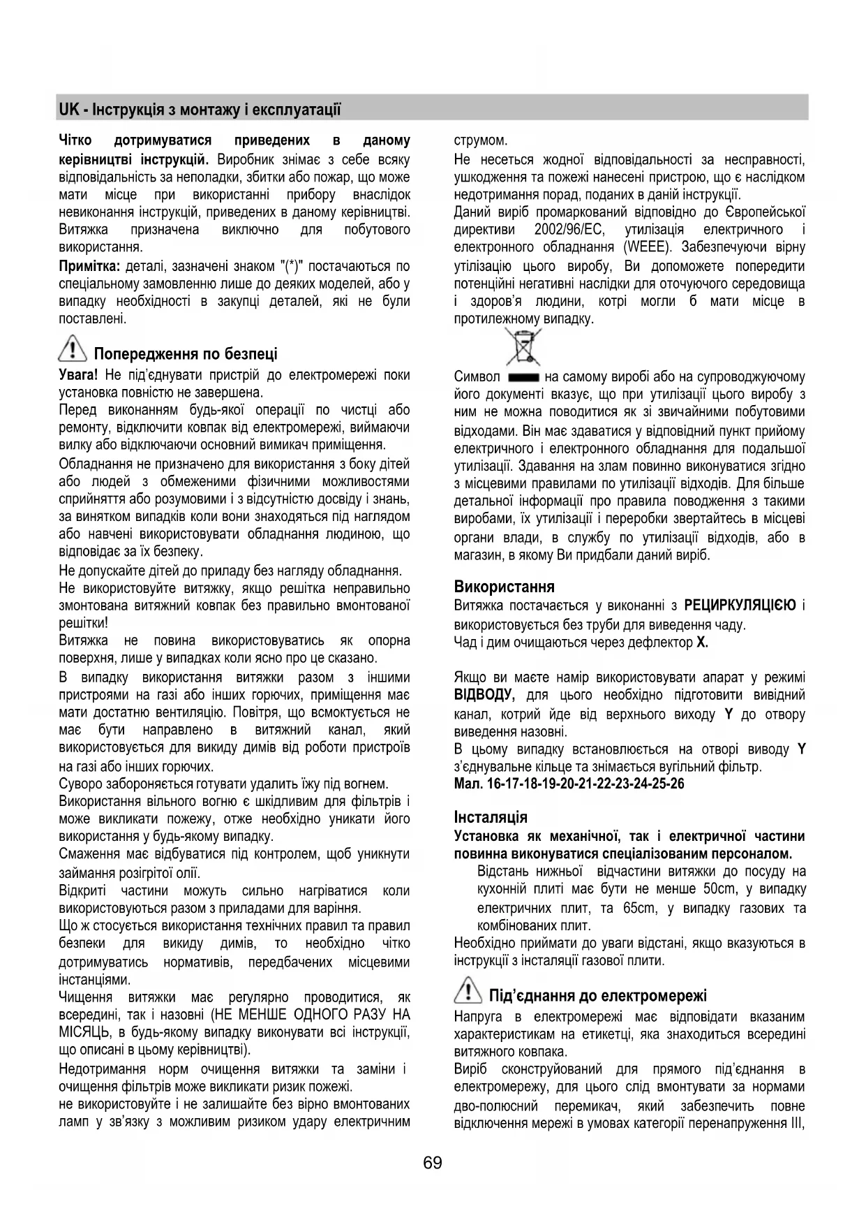 детальної інформації про правила поводження з такими виробами, їх утилізації і переробки звертайтесь в місцеві органи влади, в службу по утилізації відходів, або в магазин, в якому Ви придбали даний виріб. Використання Витяжка постачається у виконанні з РЕЦИРКУЛЯЦІЄЮ і використовується без труби для виведення чаду. Чад і дим очищаються через дефлектор Х. Якщо ви маєте намір використовувати апарат у режимі ВІДВОДУ, для цього необхідно підготовити вивідний канал, котрий йде від верхнього виходу Y до отвору виведення назовні. В цьому випадку встановлюється на отворі виводу Y з’єднувальне кільце та знімається вугільний фільтр. Мал. 16-17-18-19-20-21-22-23-24-25-26
