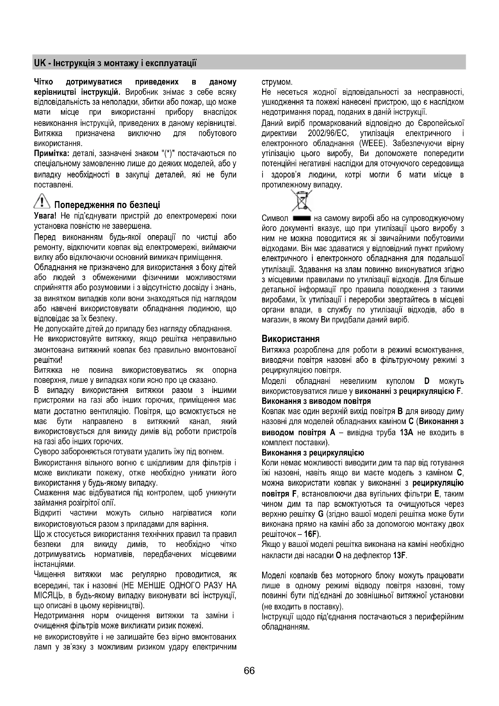 лише у випадках коли ясно про це сказано. В випадку використання витяжки разом з іншими пристроями на газі або інших горючих, приміщення має мати достатню вентиляцію. Повітря, що всмоктується не має бути направлено в витяжний канал, який використовується для викиду димів від роботи пристроїв на газі або інших горючих. Суворо забороняється готувати удалить їжу під вогнем. Використання вільного вогню є шкідливим для фільтрів і може викликати пожежу, отже необхідно уникати його використання у будь-якому випадку. Смаження має відбуватися під контролем, щоб уникнути займання розігрітої олії. Відкриті частини можуть сильно нагріватися коли використовуються разом з приладами для варіння. Що ж стосується використання технічних правил та правил безпеки для викиду димів, то необхідно чітко дотримуватись нормативів, передбачених місцевими інстанціями. Чищення витяжки має регулярно проводитися, як всередині, так і назовні (НЕ МЕНШЕ ОДНОГО РАЗУ НА МІСЯЦЬ, в будь-якому випадку виконувати всі інструкції, що описані в цьому керівництві). Недотримання норм очищення витяжки та заміни