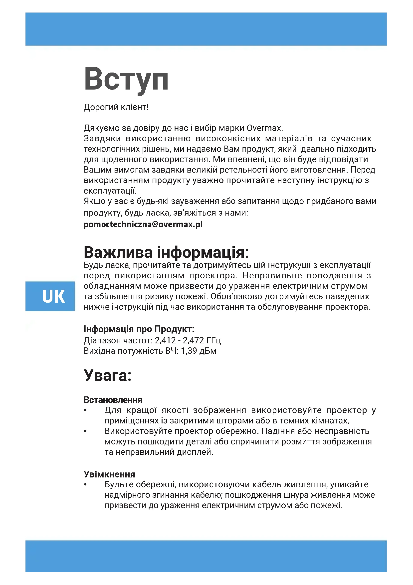 Дорогий клієнт! Дякуємо за довіру до нас i вибір марки Overmax. Завдяки використанню високоякісних матеріалів та сучасних технологічних рішень, ми надаємо Вам продукт, який ідеально підходить для щоденного використання. Ми впевнені, що він буде відповідати Вашим вимогам завдяки великій ретельності його виготовлення. Перед використанням продукту уважно прочитайте наступну інструкцію з експлуатації. Якщо у вас є будь-які зауваження або запитання щодо придбаного вами продукту, будь ласка, зв’яжіться з нами: pomoctechniczna@overmax.pl Важлива інформація: Будь ласка, прочитайте та дотримуйтесь цій інструкуції з експлуатації перед використанням проектора. Неправильне поводження з обладнанням може призвести до ураження електричним струмом та збільшення ризику пожежі. Обов’язково дотримуйтесь наведених нижче інструкцій під час використання та обслуговування проектора. Інформація про Продукт: Діапазон частот: 2,412 - 2,472 ГГц Вихідна потужність ВЧ: 1,39 дБм