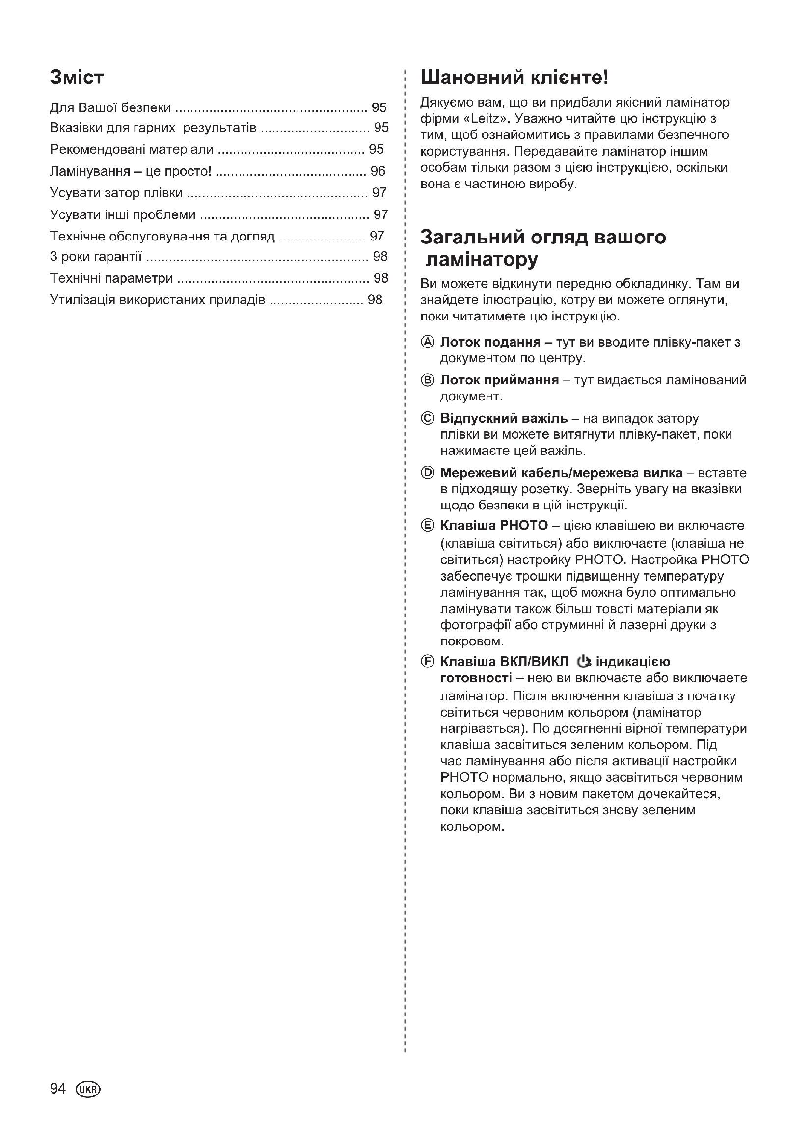- Утилізація використаних приладів Шановний клієнте! Дякуємо вам, що ви придбали якісний ламінатор фірми «Leitz». Уважно читайте цю інструкцію з тим, щоб ознайомитись з правилами безпечного користування. Передавайте ламінатор іншим особам тільки разом з цією інструкцією, оскільки вона є частиною виробу. p. 98