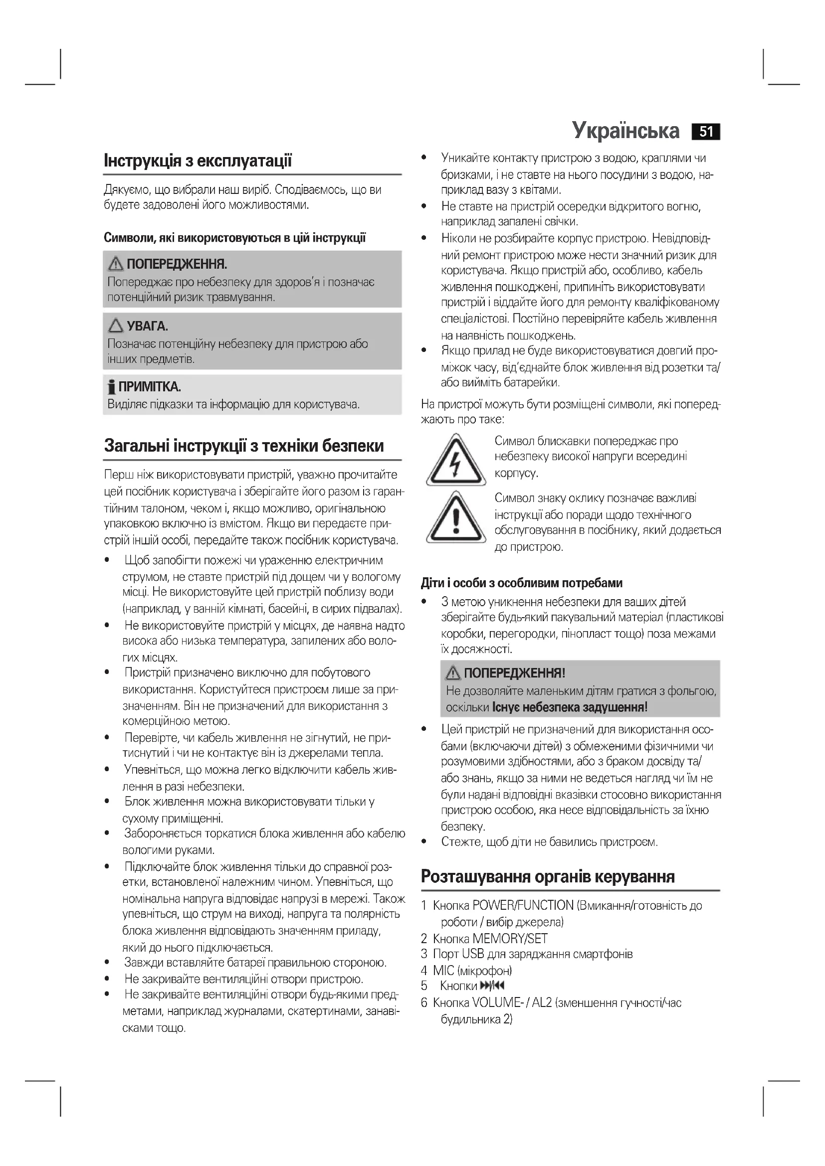 - Стежте,щобдітинебавилисьпристроєм. Розташування органів керування 1 Кнопка POWER/FUNCTION (Вмикання/готовність до роботи / вибір джерела) 2 Кнопка MEMORY/SET 3 Порт USB для заряджання смартфонів 4 MIC (мікрофон) 5 Кнопки / 6 Кнопка VOLUME- / AL2 (зменшення гучності/час будильника 2)Українська