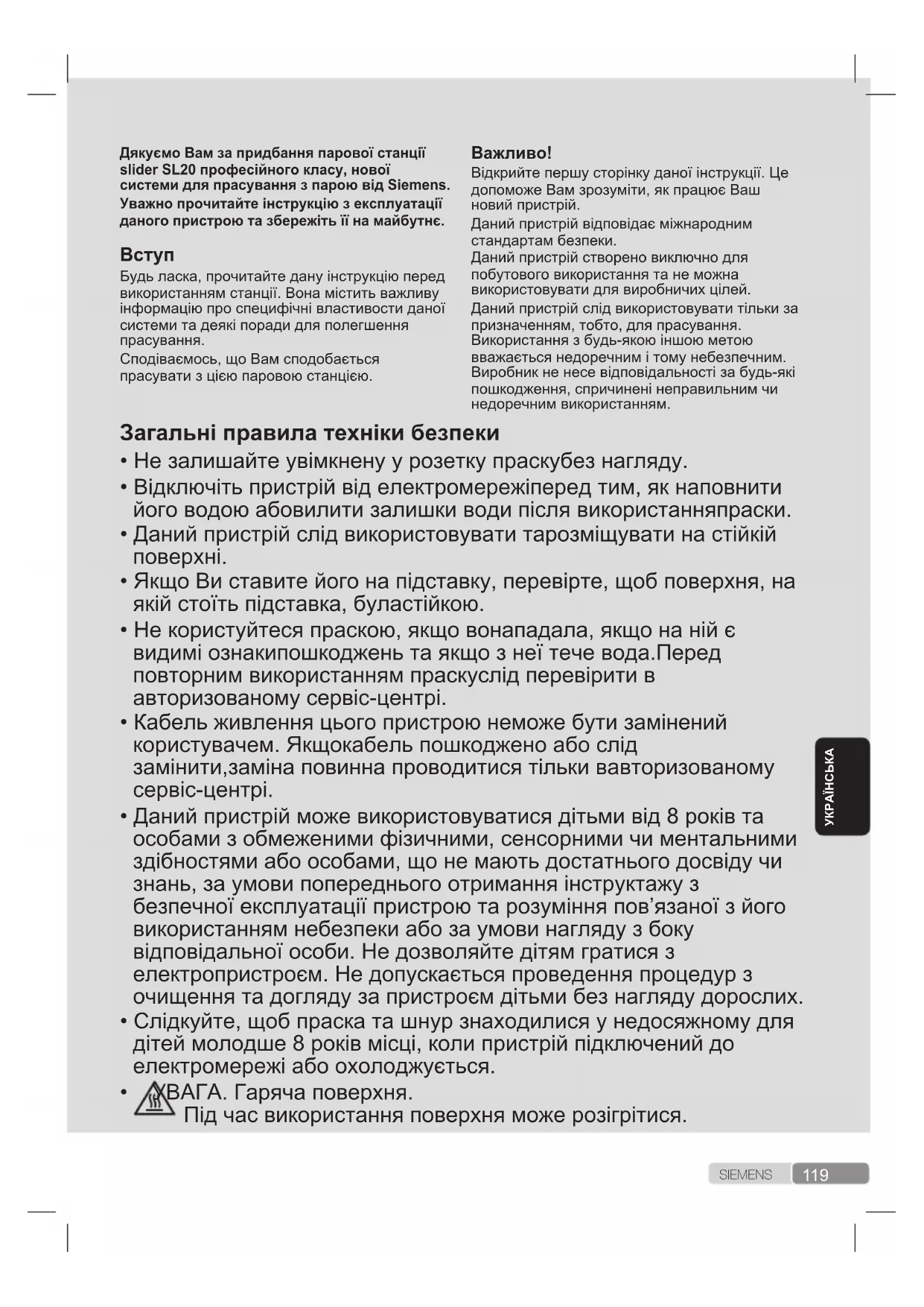 - Слідкуйте, щоб шнур не торкався гарячої підошви праски.121 S I E M E N SУКРАЇНСЬКА нагрівання для досягнення робочої температури скорочується.