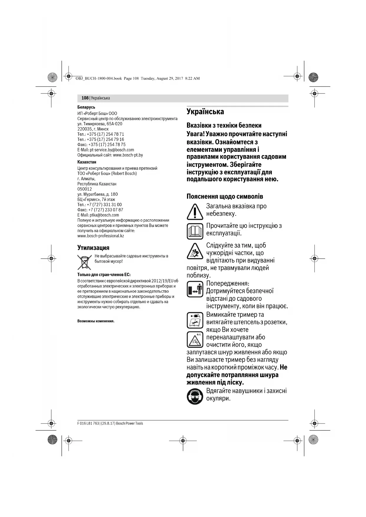 OBJ_BUCH-1800-004.book Page 108 Tuesday, August 29, 2017 8:22 AMУкраїнська | 109 Bosch Power Tools F 016 L81 763 | (29.8.17) Не працюйте під дощем і не залишайте тример під час дощу надворі. Слідкуйте за тим, щоб чужорідні тіла, що відлітають, не травмували людей