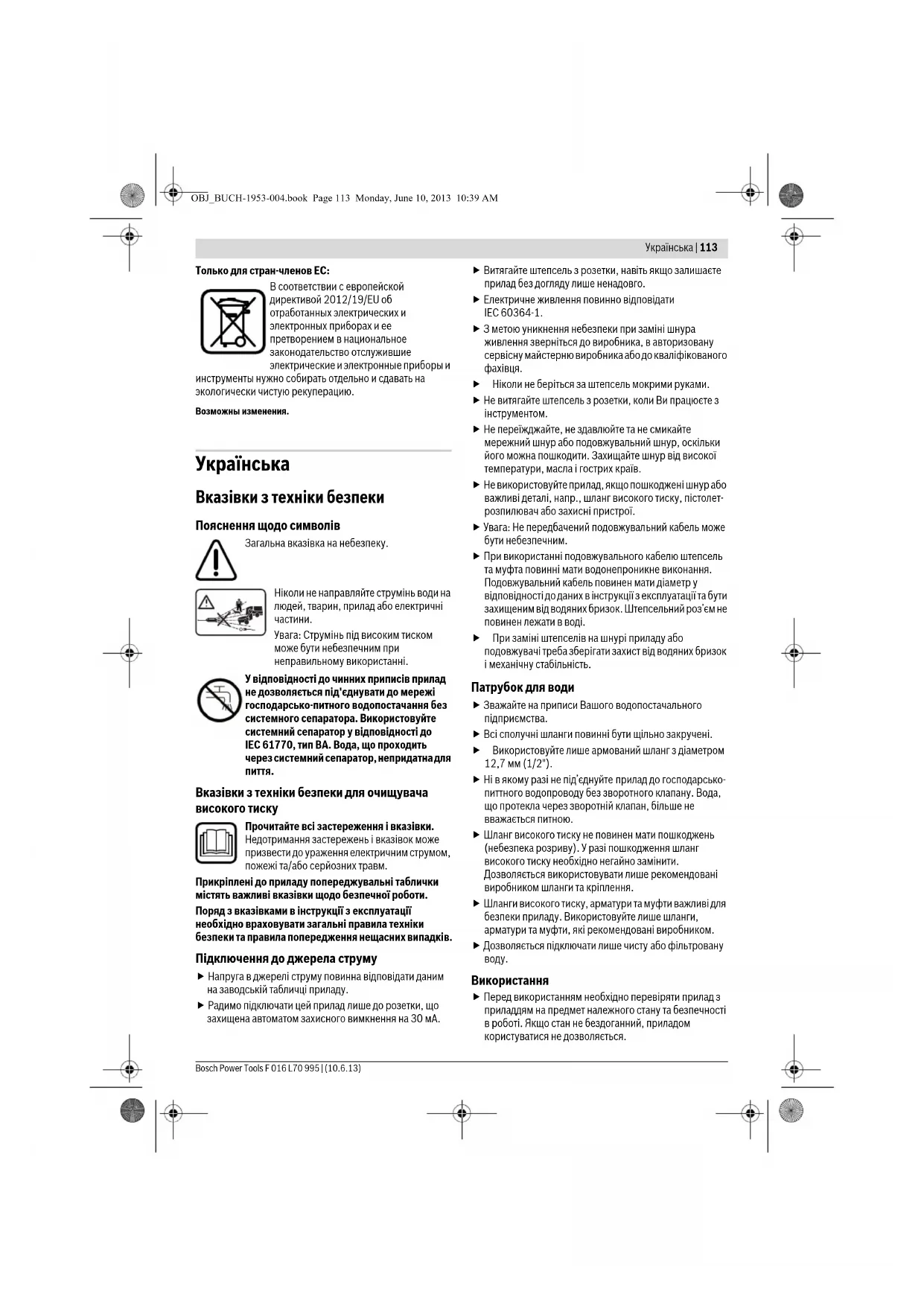 З’єднайте шланг для води (не входить в обсяг поставки) з патрубком для води та приладом. Слідкуйте за тим, щоб мережний вимикач знаходився у положенні «0» і підключіть прилад до розетки. Відкрийте водопровідний кран. Натисніть на фіксатор вимикача (задній вимикач на рукоятці пістолета-розприскувача), щоб розблокувати спусковий гачок. Притисніть спусковий гачок до упора, поки вода не потече рівномірно і з приладу та із шланга високого тиску не вийде все повітря. Відпустіть спусковий гачок . Натисніть на фіксатор вимикача (передній вимикач на рукоятці пістолета-розприскувача). Поверніть мережний вимикач. Направте пістолет- розпилювач донизу. Натисніть на фіксатор вимикача, щоб розблокувати спусковий гачок. Притисніть спусковий гачок до упора. Henk Becker Executive Vice President Engineering Helmut Heinzelmann Head of Product Certification PT/ETM9 Дія Малюнок Обсяг поставки 1 Повертання рукоятки донизу 2 Підключення трубки до пістолета- розпилювача 3 Підключення шланга високого тиску/пістолета-розприскувача 4 Насаджування сопла 5 Патрубок для води 6 Вмикання/вимикання 7 Налаштування струменя з сопла 8 Під'єднання бачка для мийного засобу 9 Очищення фільтра 10 Прочистіть форсунку 11 Зберігання пістолета-розпилювача 12 Розташування пістолета-розпилювача/ трубки/насадки під час використання 13 Встромляння шланга в кріплення шланга 14 Зберігання 15 Вибір приладдя 16 OBJ_BUCH-1953-004.book Page 116 Monday, June 10, 2013 10:39 AMУкраїнська | 117 Bosch Power Tools F 016 L70 995 | (10.6.13) Функція автостоп Прилад відключає двигун при відпусканні пістолета- розприскувача. Вказівки щодо роботи Загальні вказівки Слідкуйте за тим, щоб очищувач високого тиску стояв на рівній поверхні. Не заходьте зі шлангом високого тиску далеко вперед та не тягніть очищувач високого тиску за шланг. Це може призвести до того, що очищувач високого тиску втратить стійкість та перекинеться. Не згинайте шланг високого тиску і не переїжджайте через нього на автомобілі. Захищайте шланг високого тиску від гострих країв та кутів. Не використовуйте сопло для вихрового струменя для миття автомобілів. Попередження! Насадка Patio Cleaners придатна для використання лише на рівних поверхнях! Не використовуйте її на сходах та вертикальних поверхнях. Ніколи не торкайтеся до сопла вихрового струменя, коли воно працює! Вказівки щодо роботи з миючими засобами Використовуйте лише мийні засоби, що спеціально призначені для очищувача високого тиску. З метою захисту навколишнього середовища рекомендуємо користуватися мийними засобами ощадливо. Виконуйте інструкції щодо розведення, що зазначені на етикетці. Рекомендований метод очищення Крок 1: Розчинення бруду Встановіть насадку 3 в 1 на піну і економно подавайте мийний засіб. Крок 2: Видалення бруду Видаліть розчинений бруд струменем під високим тиском. Вказівка: Змиваючи бруд/мийний засіб з вертикальних поверхонь, починайте знизу і працюйте у напрямку вгору. Під час ополіскування працюйте у напрямку згори донизу. Пошук несправностей Симптоми Можлива причина Що робити Мотор не запускається Штепсель не встромлений в розетку Встроміть штепсель в розетку Несправна розетка Користуйтеся іншою розеткою Спрацював запобігач Замініть запобігач Пошкоджений подовжувальний кабель Спробуйте без подовжувального