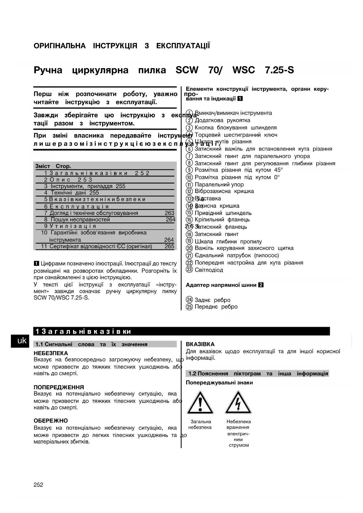 Printed: 14.05.2014 | Doc-Nr: PUB / 5070536 / 000 / 02ОРИГІНАЛЬНА ІНСТРУКЦІЯ З ЕКСПЛУАТАЦІЇ Ручна циркулярна пилка SCW 70/ WSC 7.25‑S Перш ніж розпочинати роботу, уважно про- читайте інструкцію з експлуатації. Завжди зберігайте цю інструкцію з експлуа- тації разом з інструментом. При зміні власника передавайте інструмент лишеразомізінструкцієюзексплуатації. Зміст Стор.1Загальнівказівки 2522Опис 2533 Інструменти, приладдя 2554 Технічні дані 2555Вказівкизтехнікибезпеки 2566Експлуатація 261 7 Догляд і технічне обслуговування 263 8 Пошук несправностей 2649Утилізація 26410 Гарантійні зобов'язання виробникаінструмента 264 11 Сертифікат відповідності ЄС (оригінал) 265 1 Цифрами позначено ілюстрації. Ілюстрації до тексту розміщені на розворотах обкладинки. Розгорніть їх при ознайомленні з цією інструкцією. Утекстіцієїінструкціїзексплуатації«інстру- мент»завждиозначаєручнуциркулярнупилку SCW 70/WSC 7.25-S. Елементи конструкції інструмента, органи керу- вання та індикації 1