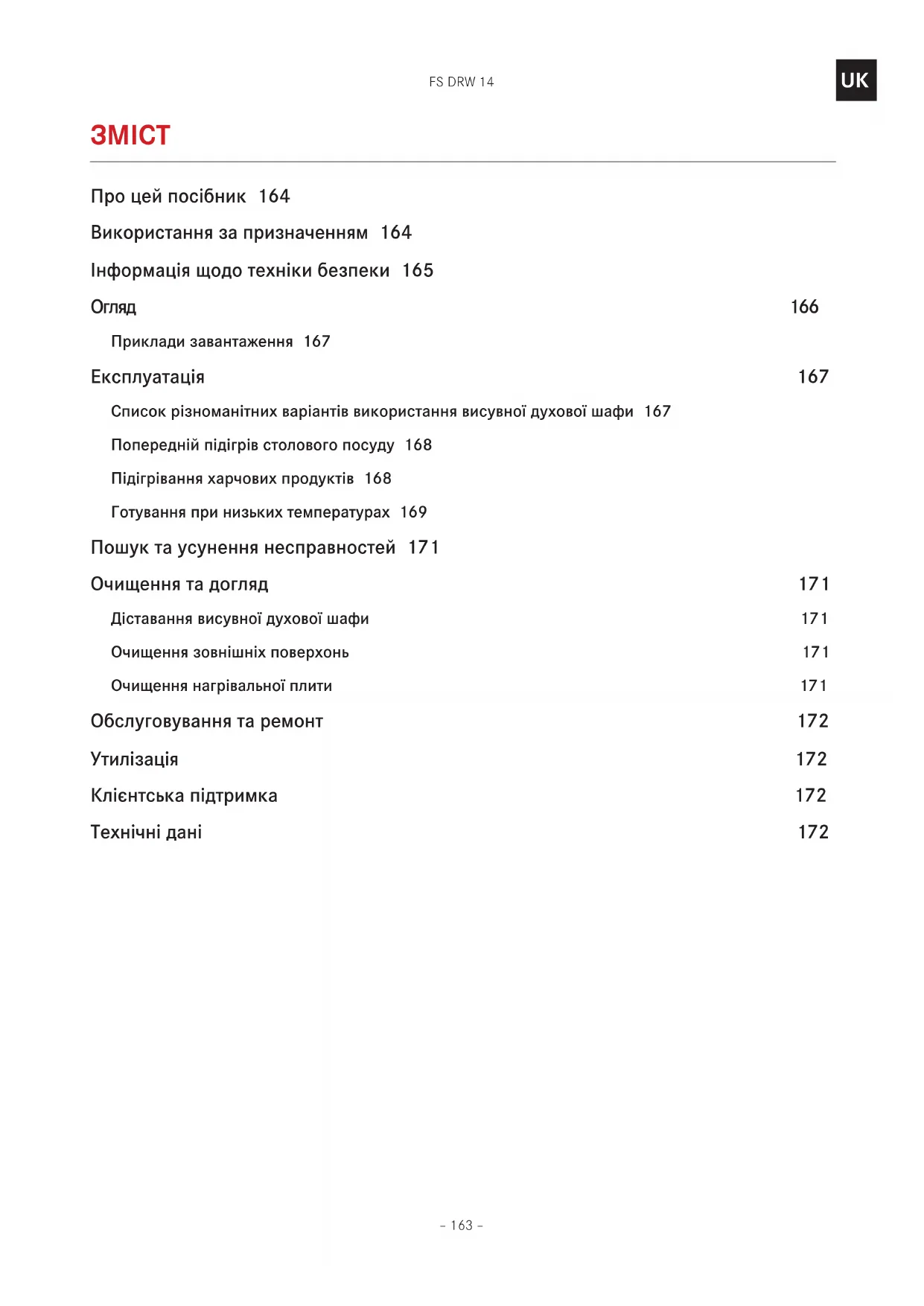 Про цей посібник 164 Використання за призначенням 164 Інформація щодо техніки безпеки 165 Огляд 166 Приклади завантаження 167 Експлуатація 167 Список різноманітних варіантів використання висувної духової шафи 167 Попередній підігрів столового посуду 168 Підігрівання харчових продуктів 168 Готування при низьких температурах 169 Пошук та усунення несправностей 171 Очищення та догляд 171 Діставання висувної духової шафи 171 Очищення зовнішніх поверхонь 171 Очищення нагрівальної плити 171 Обслуговування та ремонт 172 Утилізація 172 Клієнтська підтримка 172 Технічні дані 172FS DRW 14 – 164 –