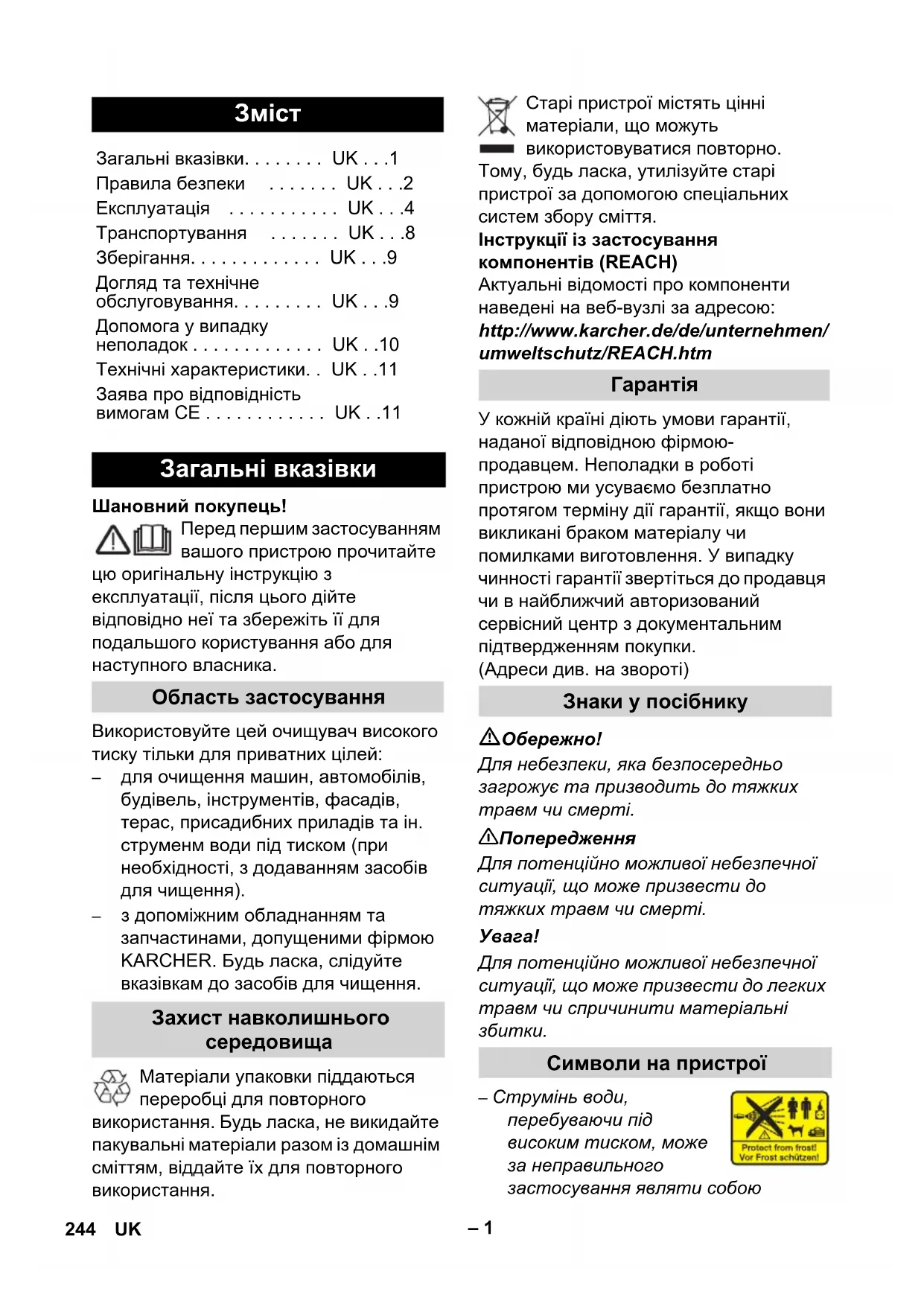 Знаки у посібнику Символи на пристрої 244 UK– 2 небезпеку. Забороняється скеровувати струмінь води на людей, тварин, увімкнене електричне обладнання чи на сам високонапірний мийний аппарат. – Мороз може пошкодити пристрій, що не був повністю спорожнений. Зберігати пристрій узимку у теплому приміщенні.