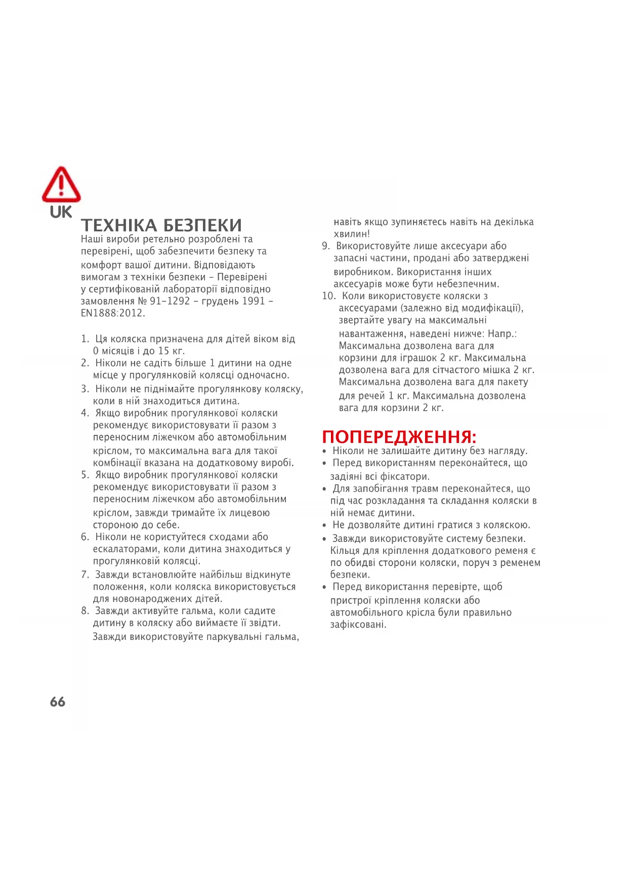 ТЕХНІКА БЕЗПЕКИ Наші вироби ретельно розроблені та перевірені, щоб забезпечити безпеку та комфорт вашої дитини. Відповідають вимогам з техніки безпеки - Перевірені у сертифікованій лабораторії відповідно замовлення № 91-1292 - грудень 1991 - EN1888:2012.