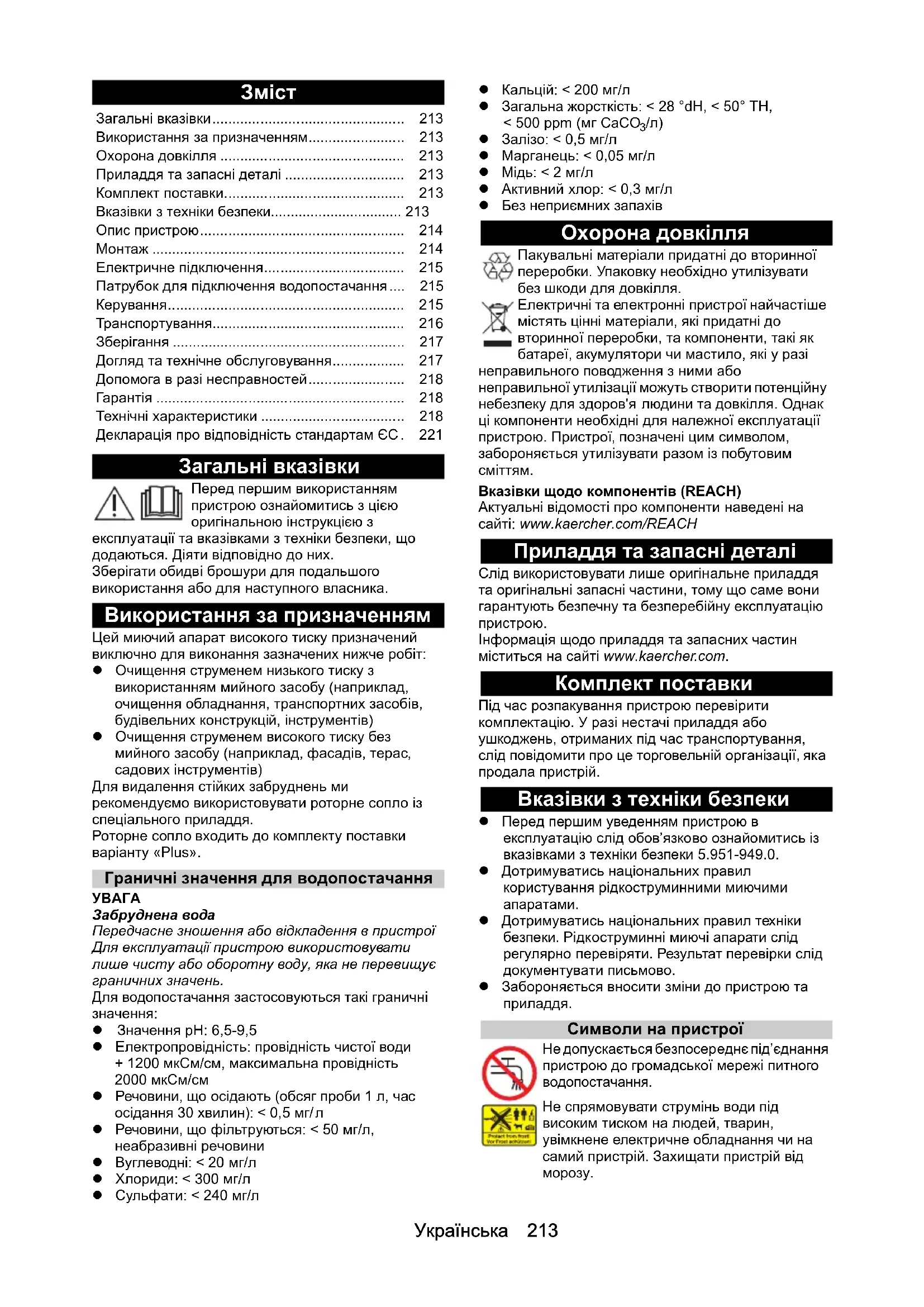Вказівки щодо компонентів (REACH) Актуальні відомості про компоненти наведені на сайті: www.kaercher.com/REACH Приладдя та запасні деталі Слід використовувати лише оригінальне приладдя та оригінальні запасні частини, тому що саме вони гарантують безпечну та безперебійну експлуатацію