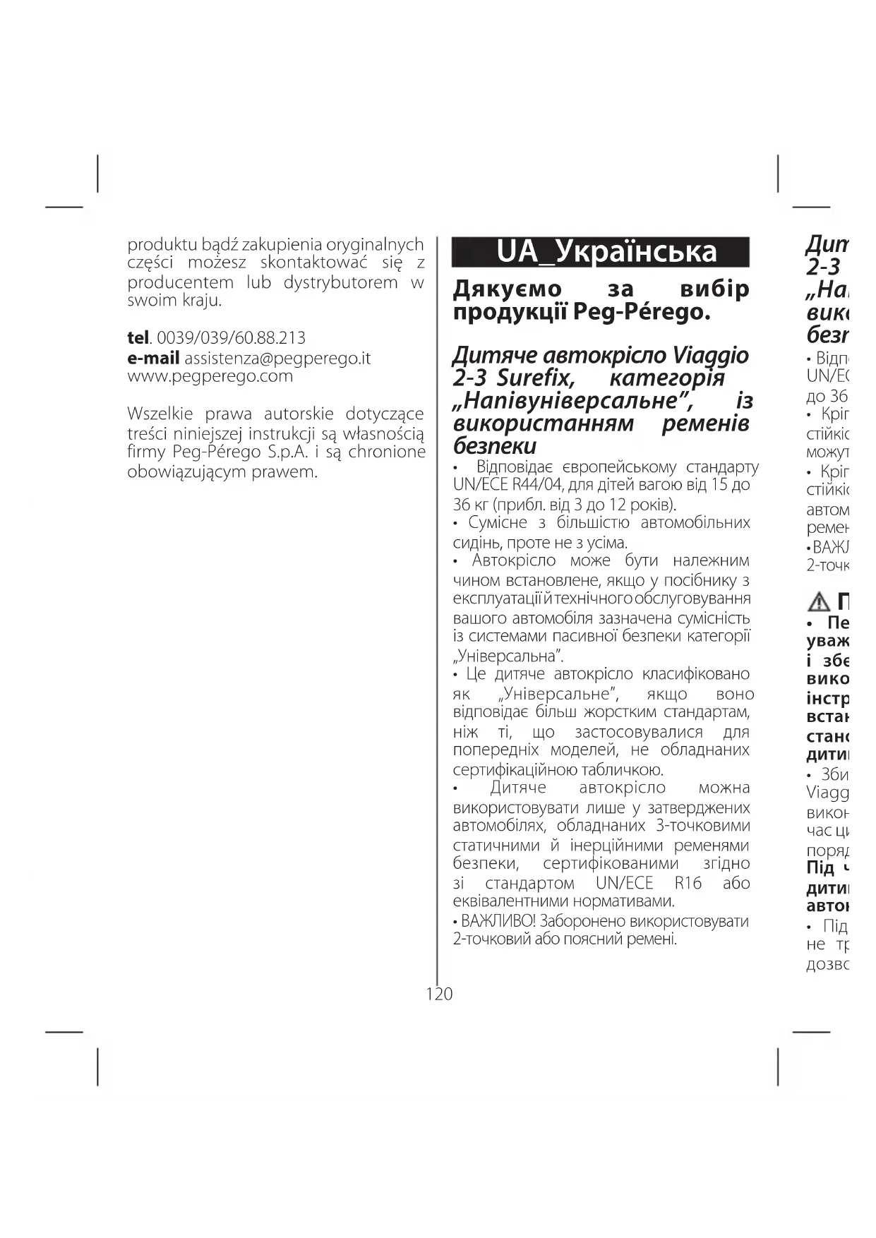 - Під час поїздки у жодному разі не тримайте дитину на руках і не дозволяйте їй сидіти будь-де в121 Дякуємо за вибір продукції Peg-Pérego. Дитяче автокрісло Viaggio 2-3 Surefix, категорія „Напівуніверсальне”, із використанням ременів