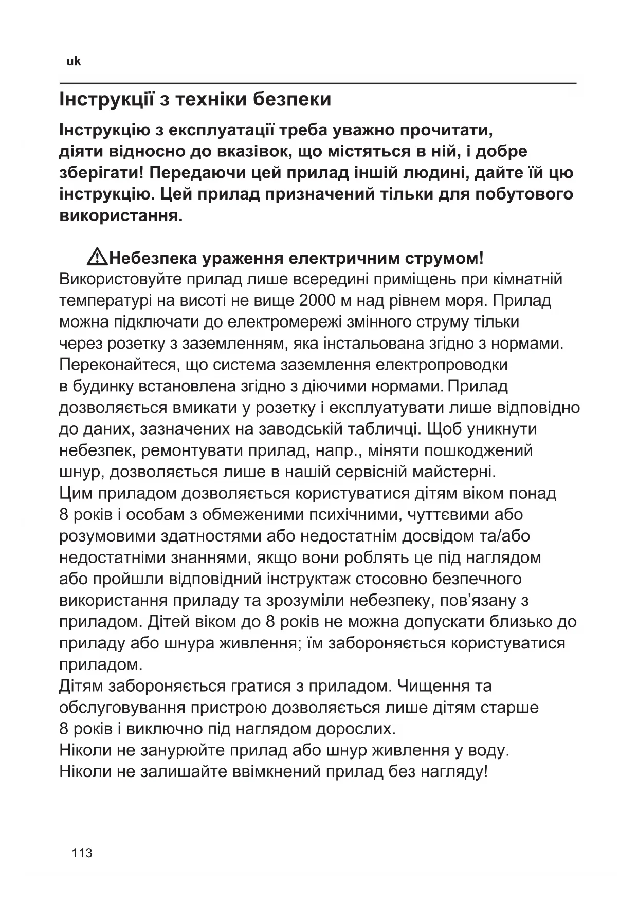 Дітям забороняється гратися з приладом. Чищення та обслуговування пристрою дозволяється лише дітям старше 8 років і виключно під наглядом дорослих. Ніколи не занурюйте прилад або шнур живлення у воду. Ніколи не залишайте ввімкнений прилад без нагляду!114