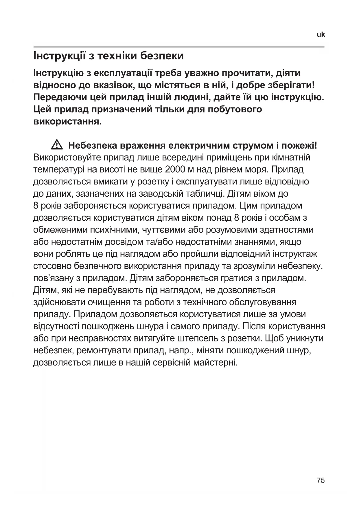 Інструкції з техніки безпеки Інструкцію з експлуатації треба уважно прочитати, діяти відносно до вказівок, що містяться в ній, і добре зберігати! Передаючи цей прилад іншій людині, дайте їй цю інструкцію. Цей прилад призначений тільки для побутового використання. W Небезпека враження електричним струмом і пожежі! Використовуйтеприладлишевсерединіприміщеньприкімнатній температурінависотіневище2000мнадрівнемморя.Прилад дозволяєтьсявмикатиурозеткуіексплуатуватилишевідповідно доданих,зазначенихназаводськійтабличці.Дітямвікомдо 8роківзабороняєтьсякористуватисяприладом.Цимприладом дозволяєтьсякористуватисядітямвікомпонад8роківіособамз обмеженимипсихічними,чуттєвимиаборозумовимиздатностями абонедостатнімдосвідомта/абонедостатнімизнаннями,якщо вонироблятьцепіднаглядомабопройшливідповіднийінструктаж стосовнобезпечноговикористанняприладутазрозумілинебезпеку, пов’язанузприладом.Дітямзабороняєтьсягратисязприладом. Дітям,якінеперебуваютьпіднаглядом,недозволяється здійснюватиочищеннятароботизтехнічногообслуговування приладу.Приладомдозволяєтьсякористуватисялишезаумови відсутностіпошкодженьшнураісамогоприладу.Післякористування абопринесправностяхвитягуйтештепсельзрозетки.Щобуникнути небезпек,ремонтуватиприлад,напр.,мінятипошкодженийшнур, дозволяєтьсялишевнашійсервісніймайстерні.76