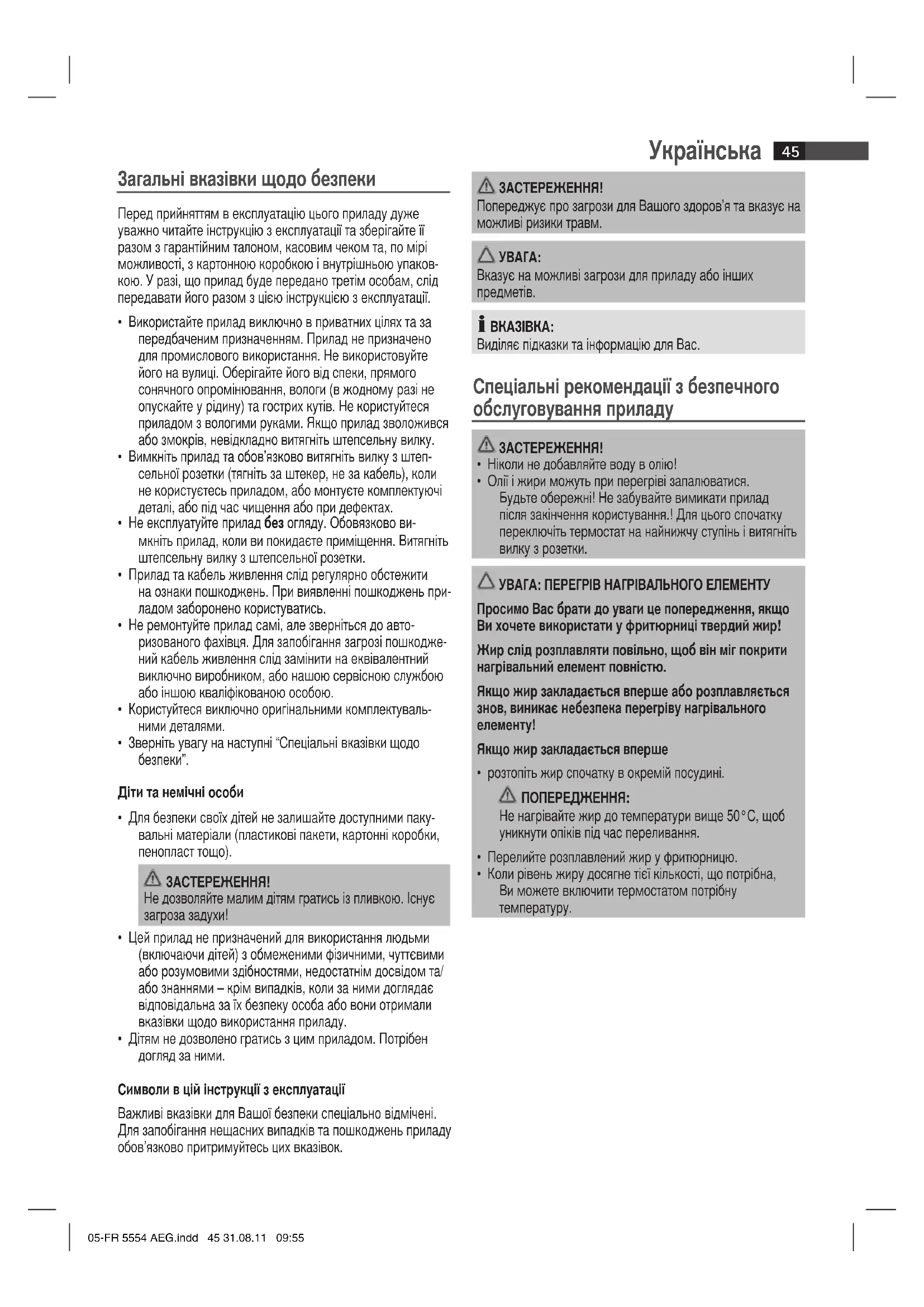 - Коли рівень жиру досягне тієї кількості, що потрібна, Ви можете включити термостатом потрібну температуру. 05-FR 5554 AEG.indd 45 31.08.11 09:55Українська