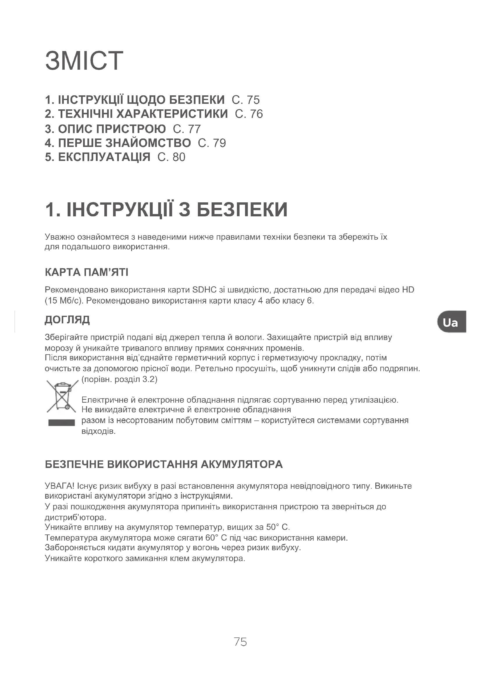 КАРТА ПАМ’ЯТІ Рекомендовано використання карти SDHC зі швидкістю, достатньою для передачі відео HD (15 Мб/с). Рекомендовано використання карти класу 4 або класу 6. Зберігайте пристрій подалі від джерел тепла й вологи. Захищайте пристрій від впливу морозу й уникайте тривалого впливу прямих сонячних променів. Після використання від’єднайте герметичний корпус і герметизуючу прокладку, потім очистьте за допомогою прісної води. Ретельно просушіть, щоб уникнути слідів або подряпин. (порівн. розділ 3.2)Електричне й електронне обладнання підлягає сортуванню перед утилізацією. Не викидайте електричне й електронне обладнання разом із несортованим побутовим сміттям – користуйтеся системами сортування відходів. БЕЗПЕЧНЕ ВИКОРИСТАННЯ АКУМУЛЯТОРА УВАГА! Існує ризик вибуху в разі встановлення акумулятора невідповідного типу. Викиньте використані акумулятори згідно з інструкціями. У разі пошкодження акумулятора припиніть використання пристрою та зверніться до дистриб’ютора. Уникайте впливу на акумулятор температур, вищих за 50° C.Температура акумулятора може сягати 60° C під час використання камери.Забороняється кидати акумулятор у вогонь через ризик вибуху. Уникайте короткого замикання клем акумулятора.