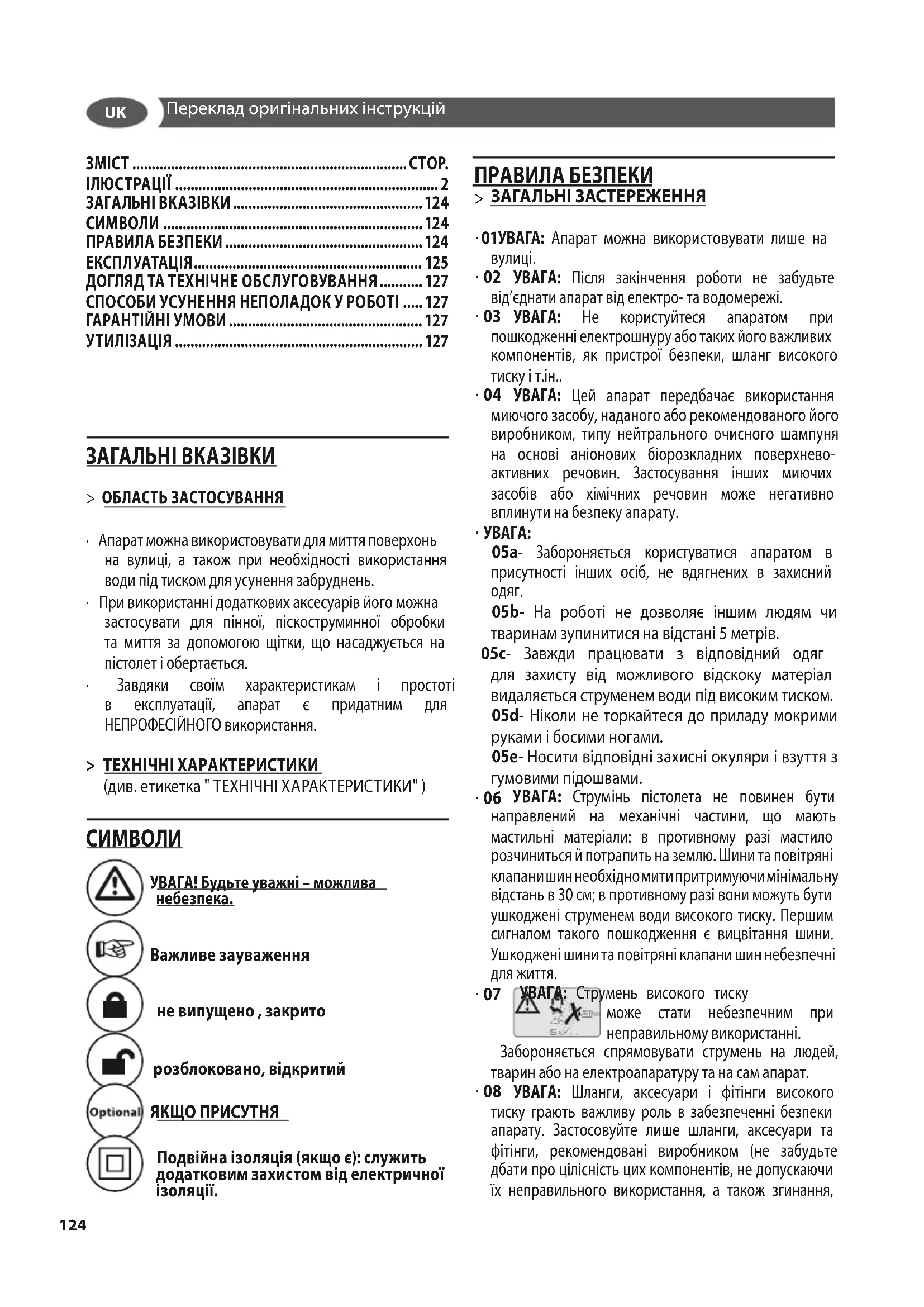 - 08 УВАГА: Шланги, аксесуари i фiтiнги високого тиску грають важливу роль в забезпеченнi безпеки апарату. Застосовуйте лише шланги, аксесуари та фiтiнги, рекомендованi виробником (не забудьте дбати про цiлiснiсть цих компонентiв, не допускаючи їх неправильного використання, а також згинання, ЗМІ СТ .......................................................................СТОР. ІЛЮСТРАЦІЇ .................................................................... 2 ЗАГАЛЬНІ ВКАЗІВКИ ................................................. 124 СИМВОЛИ ................................................................... 124 ПРАВИЛА БЕЗПЕКИ ................................................... 124 ЕКСПЛУАТАЦІЯ ........................................................... 125 ДОГЛЯД ТА ТЕХНІЧНЕ ОБСЛУГОВУВАННЯ ........... 127 СПОСОБИ УСУНЕННЯ НЕПОЛАДОК У РОБОТІ ..... 127 ГАРАНТІЙНІ УМОВИ .................................................. 127 УТИЛІЗАЦІЯ ................................................................ 127UK