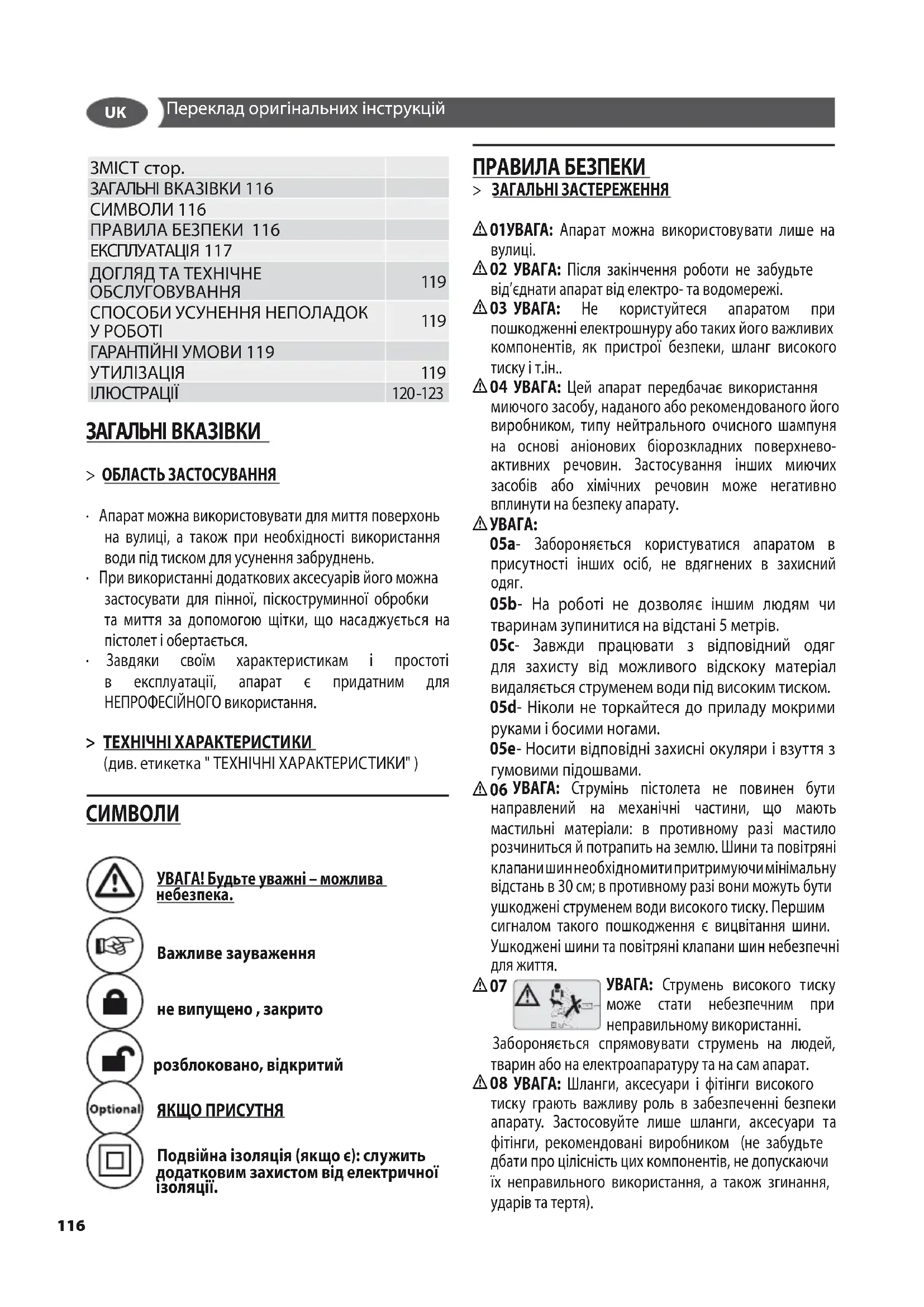 - 03 УВАГА: Не користуйтеся апаратом при пошкодженнi електрошнуру або таких його важливих компонентiв, як пристрої безпеки, шланг високого тиску i т.iн..