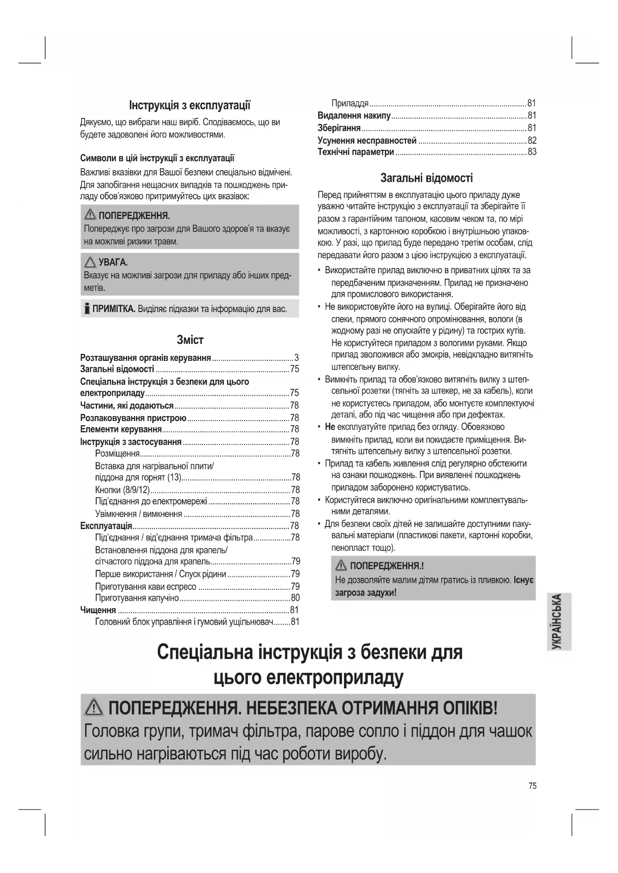 - Головний блок управління і гумовий ущільнювач Спеціальна інструкція з безпеки для цього електроприладу ПОПЕРЕДЖЕННЯ. НЕБЕЗПЕКА ОТРИМАННЯ ОПІКІВ! Головка групи, тримач фільтра, парове сопло і піддон для чашок сильно нагріваються під час роботи виробу.76 ПОПЕРЕДЖЕННЯ. НЕБЕЗПЕКА ОТРИМАННЯ ОПІКІВ! p. 81