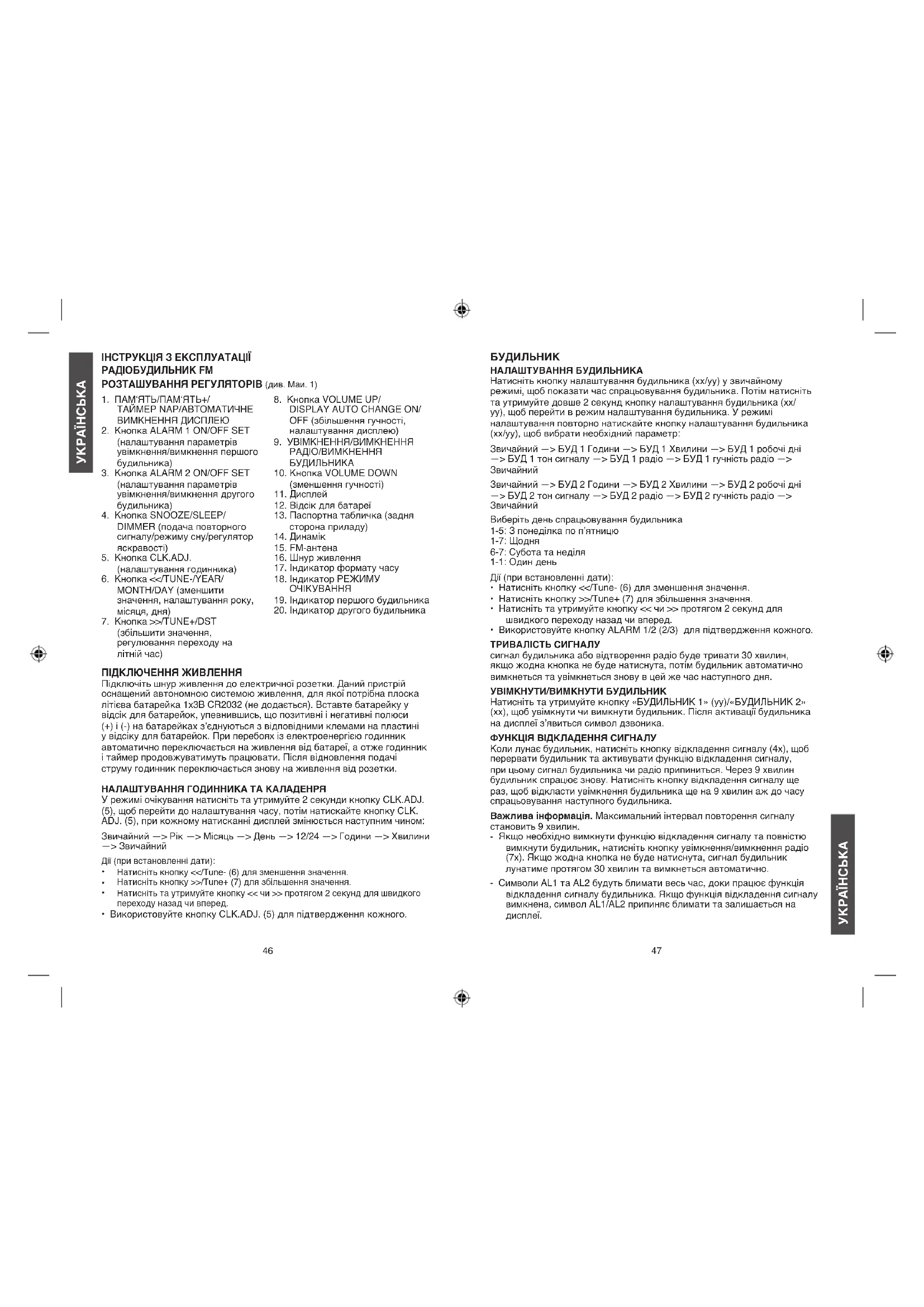 сигнал будильника або відтворення радіо буде тривати 30 хвилин, якщо жодна кнопка не буде натиснута, потім будильник автоматично вимкнеться та увімкнеться знову в цей же час наступного дня.