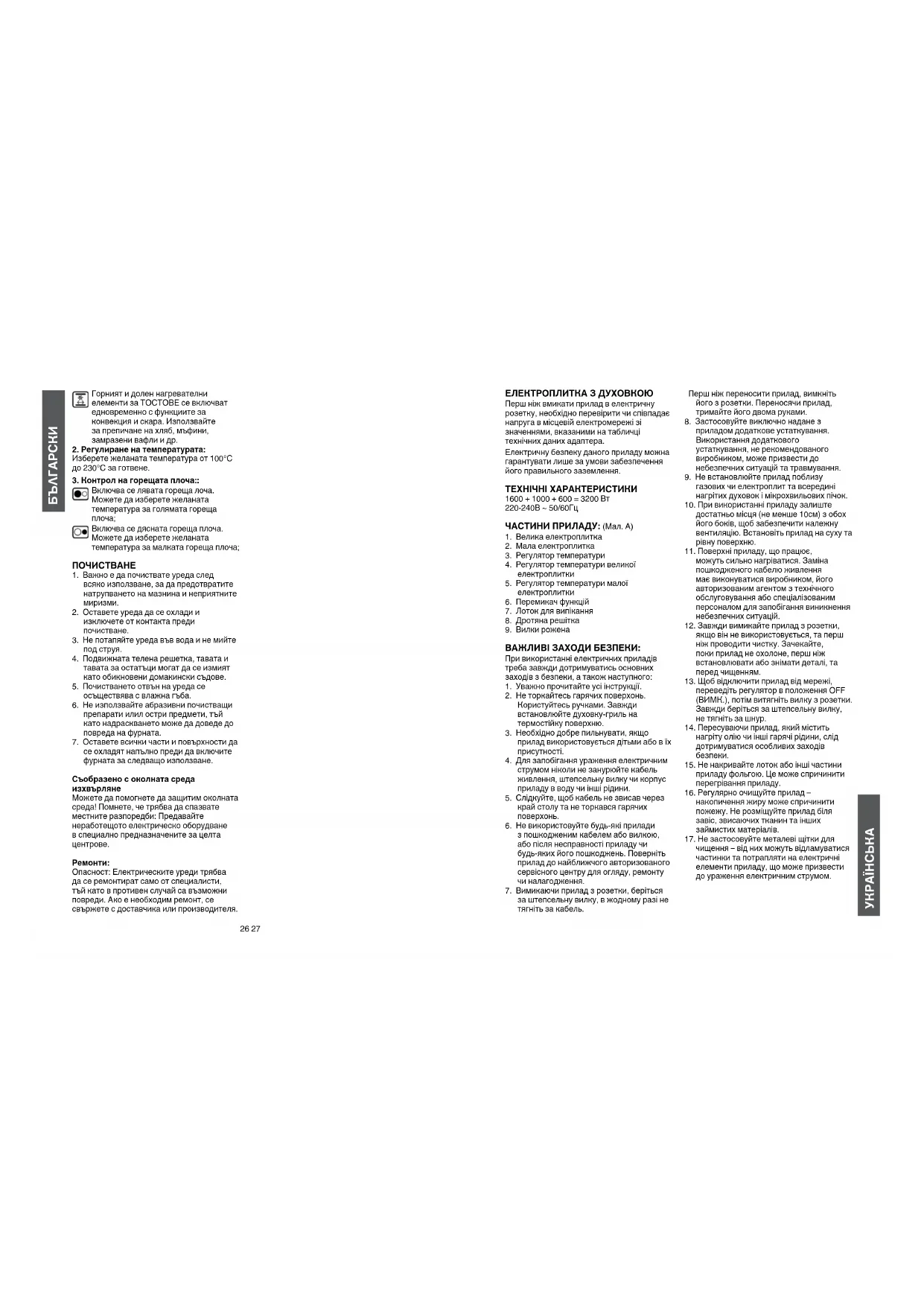 Опасност: Електрическите уреди трябва да се ремонтират само от специалисти, тъй като в противен случай са възможни повреди. Ако е необходим ремонт, се свържете с доставчика или производителя. ЕЛЕКТРОПЛИТКА З ДУХОВКОЮ Перш ніж вмикати прилад в електричну розетку, необхідно перевірити чи співпадає напруга в місцевій електромережі зі значеннями, вказаними на табличці технічних даних адаптера. Електричну безпеку даного приладу можна гарантувати лише за умови забезпечення його правильного заземлення. ТЕХНІЧНІ ХАРАКТЕРИСТИКИ 1600 + 1000 + 600 = 3200 Вт 220-240В ~ 50/60Гц ЧАСТИНИ ПРИЛАДУ: (Мал. A)