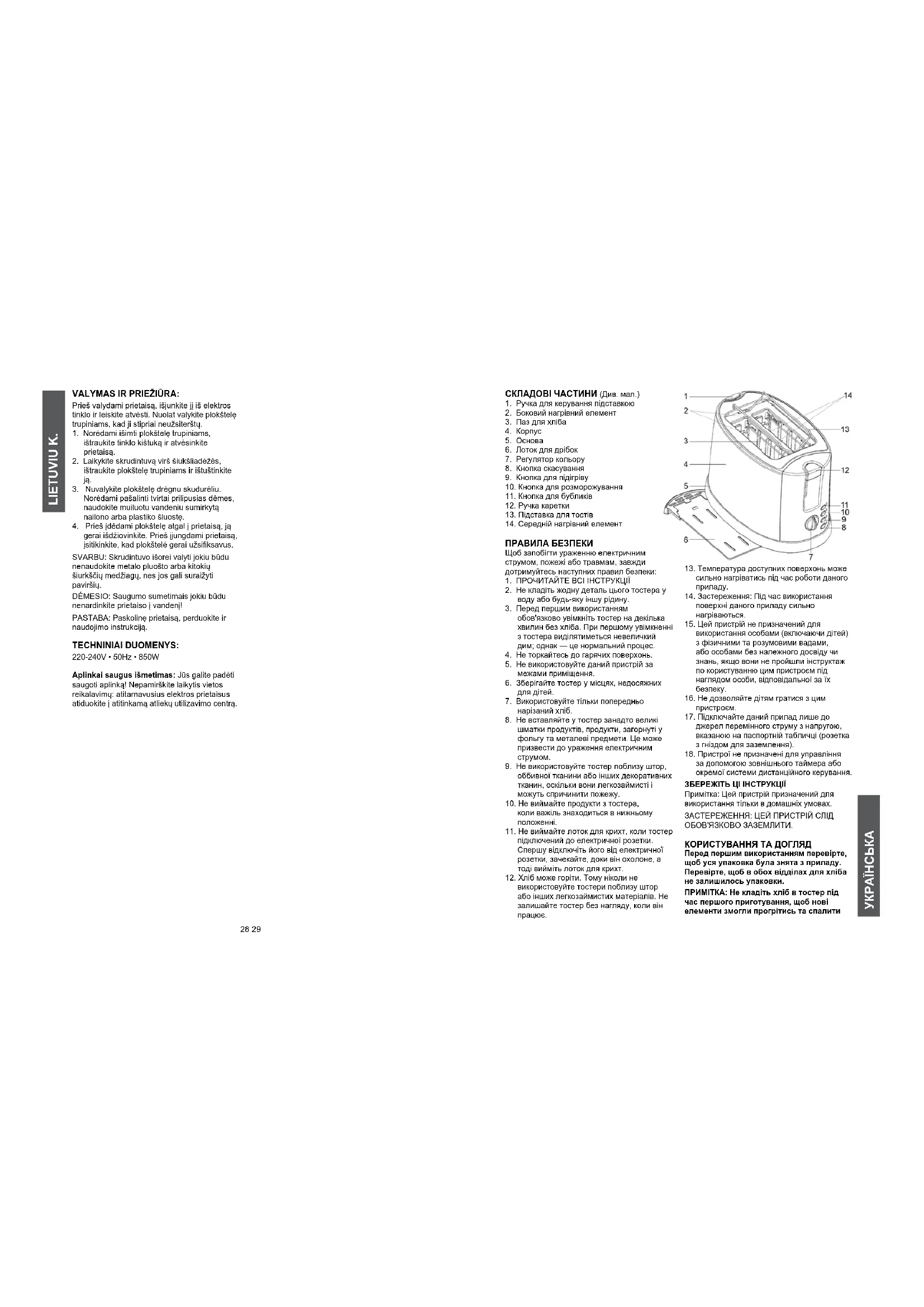 за допомогою зовнішнього таймера або окремої системи дистанційного керування. ЗБЕРЕЖІТЬ ЦІ ІНСТРУКЦІЇ Примітка: Цей пристрій призначений для використання тільки в домашніх умовах. ЗАСТЕРЕЖЕННЯ: ЦЕЙ ПРИСТРІЙ СЛІД ОБОВ'ЯЗКОВО ЗАЗЕМЛИТИ. КОРИСТУВАННЯ ТА ДОГЛЯД Перед першим використанням перевірте, щоб уся упаковка була знята з приладу. Перевірте, щоб в обох відділах для хліба не залишилось упаковки. ПРИМІТКА: Не кладіть хліб в тостер під час першого приготування, щоб нові елементи змогли прогрітись та спалити30 31