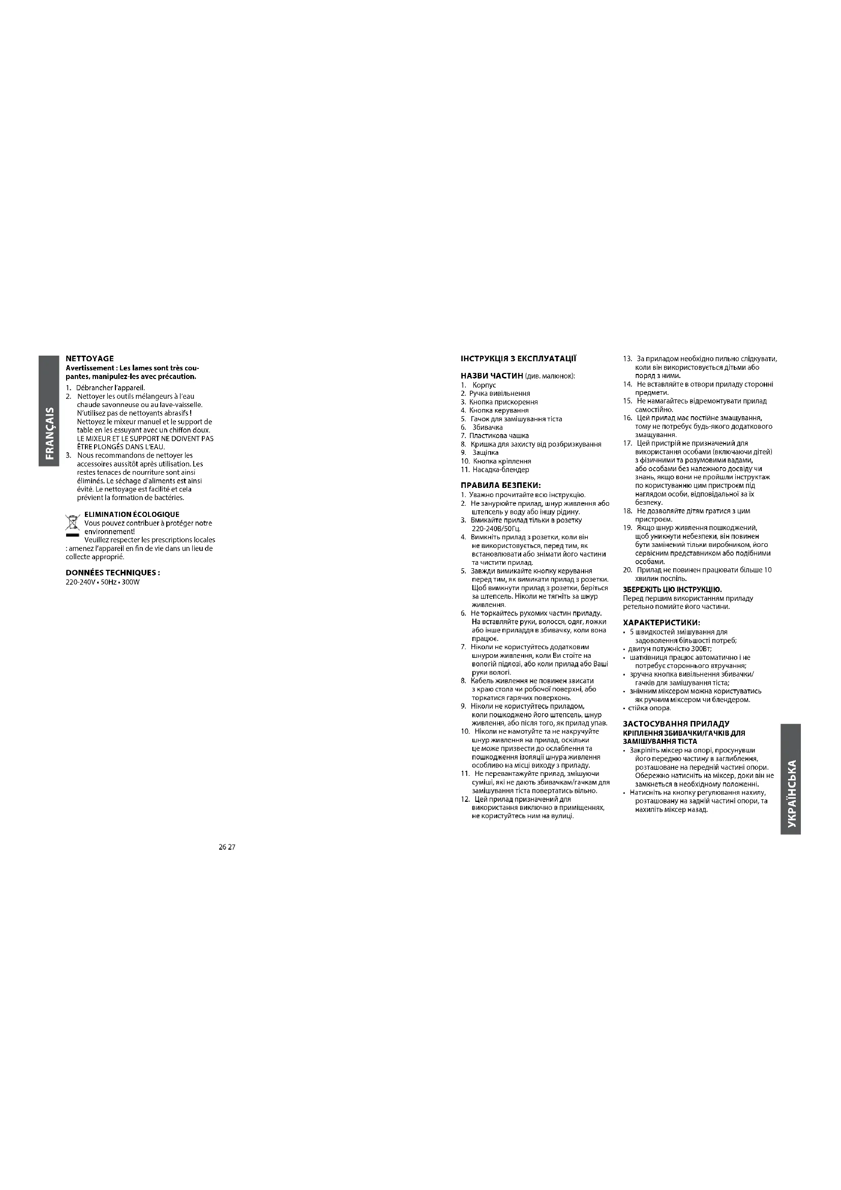 завершенню користування ними. В такий спосіб легше відмити продукти, прилиплі до них, запобігаючи засиханню прилиплих продуктів на насадках. Це запобігає утворенню бактерій. ЕКОЛОГІЧНО ЧИСТА УТИЛІЗАЦІЯ Ви можете допомогти захистити навколишнє середовище. Будь ласка, поважайте місцеві закони: здавайте зламані електричні прилади у відповідні центри утилізації. ТЕХНІЧНІ ХАРАКТЕРИСТИКИ: 220-240В • 50Гц • 300Вт ТЕРМІН ПРИДАТНОСТІ: НЕ ОБМЕЖЕНИЙ.30 31