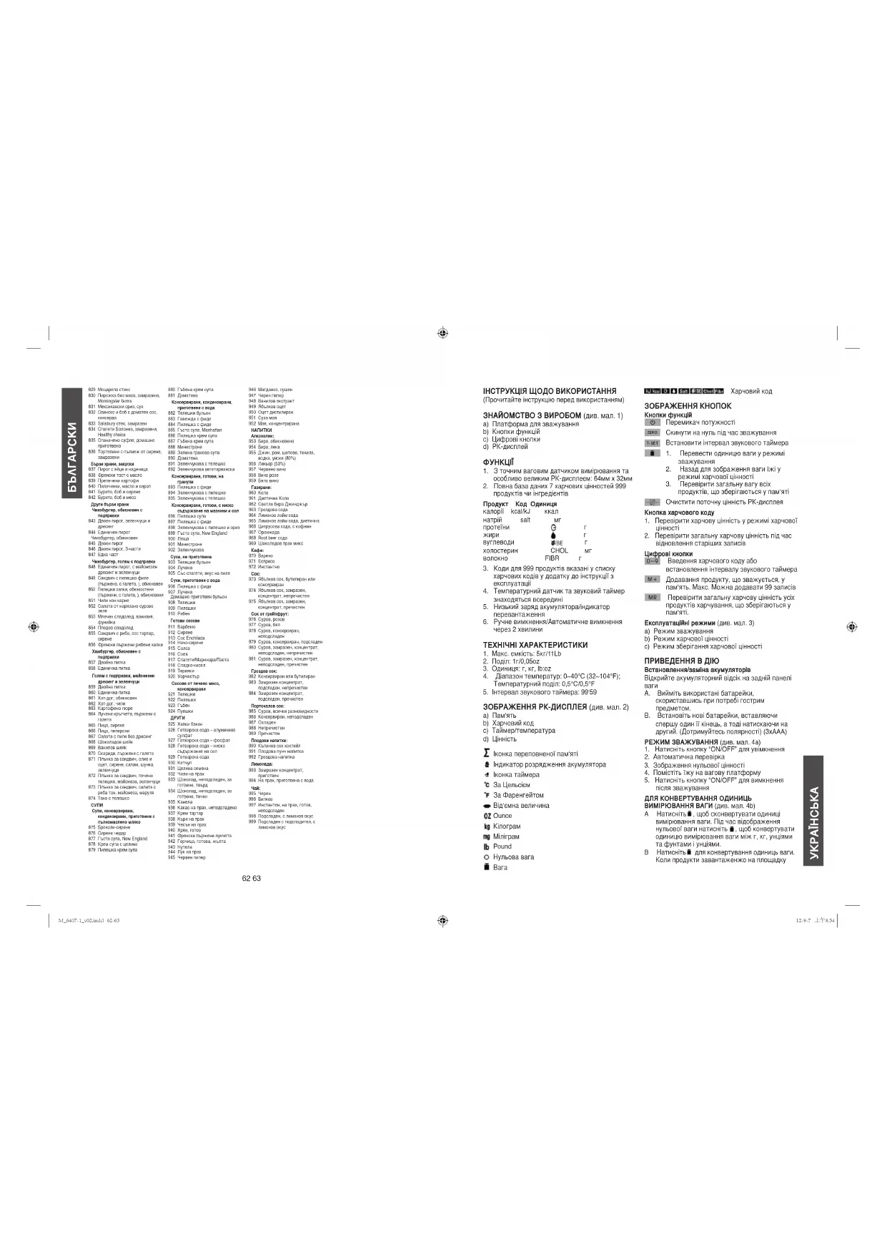 використання, а не для використання з комерційною або медичною метою. ТЕРМІН ПРИДАТНОСТІ: НЕ ОБМЕЖЕНИЙ. СПИСОК ЇЖІ ДЛЯ ЕЛЕКТРОННОЇ ДІєТИЧНОЇ ВАГИКод Назва продукту ХЛІБ Хліб, крупи, макаронні вироби та рис1 Рогалики, прості2 Рогалики, ізюм з корицею3 Рогалики, яйце4 Банановий хліб, рецепт, маргарин5 Ячмінь, шеретований, неварений6 Сухе печиво, просте або маслянка, рецепт, 2% молока7 Сухе печиво, заморожене тісто, печене, звичайне Хліб8 Полущена пшениця9 Яєчний хліб10 Французьке, Віденське, закисле тісто11 Індійський смажений хліб (наан)12 Італійський хліб13 Змішані зерна, несмажені14 Вівсяне борошно, несмажене15 Лаваш16 Житній хліб, несмажений17 Ізюм, несмажений18 Жито, несмажене19 Жито, низькокалорійне20 Пшениця, несмажена21 Пшениця, низькокалорійна22 Білий, несмажений23 Білий, м‘які шматочки24 Білий, низькокалорійний25 З цільної пшениці, несмажений 26 Шматочки хліба, сухі, різані, звичайні, вищого сорту27 Шматочки хліба, сухі, різані, приправлені, не вищого сорту28 Хлібна начинка, суха суміш Сніданоковий хліб/Мюслі29 Сніданковий хліб, вівсяні пластівці, фрукти, без жиру30 Мюслі, тверді, звичайні31 Мюслі, м‘які, незалиті, шоколадна стружка32 Мюслі, м‘які, незалиті, ізюм33 Вівсяні зерна, фрукти34 Булгур, варений35 Кукурудзяний хліб, мікс36 Кукурудзяний хліб, рецепт, 2% молока37 Кукурудзяне зерно, жовте, сухе, цілі зерна38 Кукурудзяне зерно, без зародків, вищого сорту39 Кукурудзяний крохмаль40 Кускус, неварений41 Грінки до супу, приправлені42 Англійська здоба, звичайна, несмажена43 Французький тост, рецепт, 2% молока, смажений на маргарині44 Французький тост, морожений Борошно45 Хлібне борошно, вищого сорту46 Гречане борошно, непросіяне47 Борошно для печива та тортів, вищого сорту, непросіяне, дрібного помолу48 Кукурудзяне борошно, маіс, вищого сорту49 Борошно з сіллю та розрихлювачем, для всіх приготувань, непросіяне, дрібного помолу50 Пшеничне борошно, для усіх приготувань, вищого сорту, просіяне, дрібного помолу51 Пшеничне борошно, для усіх приготувань, вищого сорту, непросіяне, дрібного помолу52 Маца, проста Здоби53 Здоби, з чорницею, комерційні54 Здоби, з чорницею, мікс55 Здоби, висівки з ізюмом56 Здоби, кукурудзяні, комерційні57 Здоби, кукурудзяний мікс58 Здоби, вівсяні висівки, комерційні59 Вівсяні висівки, неварені60 Оладки, морожені, готові61 Оладки, повний мікс62 Оладки, мікс, 2% молока, яйце та олія63 Скоринка пирога, печена, рецепт64 Скоринка пирога, печена, морожена65 Скоринка пирога, крекер з борошна грубого помолу Пиріг, комерційний66 Яблучний67 Чорничний68 Вишневий69 Шоколадний70 Лимонна мерінга71 Горіх пекан72 Гарбузяний73 Булочки, обідні74 Булочки, гамбургер або хот-дог75 Солодкі булочки, кориця з ізюмом, комерційні76 Солодкі булочки, кориця, заморожене тісто, глазуровані77 Тако, печений78 Крупа тапіока, зернова, суха79 Підсмажені кондитерські вироби, фруктові80 Підсмажені кондитерські вироби, з низьким вмістом жиру81 Тортіла, готова до приготування, зерно82 Тортіла, готова до приготування, борошно83 Вафлі, прості, рецепт84 Вафлі, прості, морожені, смажені85 Вафлі, прості, з низьким вмістом жирів86 Ціла пшениця; тверда, перемішана, дрібного помолу87 Зародки пшениці, смажені, звичайні Злаки, варені88 Кукрудзяне зерно, біле89 Кукрудзяне зерно, жовте90 Кукрудзяне зерно, швидкого приготування, просте91 Пшеничне пюре, звичайне92 Пшеничне пюре, швидкого приготування93 Пшеничне пюре, мікс, просте94 Ві