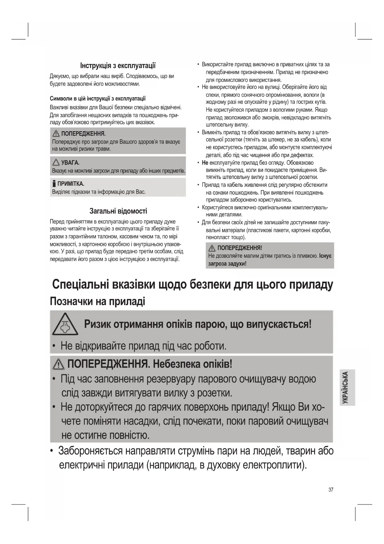 Виділяє підказки та інформацію для Вас. Загальні відомості Перед прийняттям в експлуатацію цього приладу дуже уважно читайте інструкцію з експлуатації та зберігайте її разом з гарантійним талоном, касовим чеком та, по мірі можливості, з картонною коробкою і внутрішньою упаков- кою. У разі, що прилад буде передано третім особам, слід передавати його разом з цією інструкцією з експлуатації. Спеціальні вказівки щодо безпеки для цього приладу Позначки на приладі Ризик отримання опіків парою, що випускається!