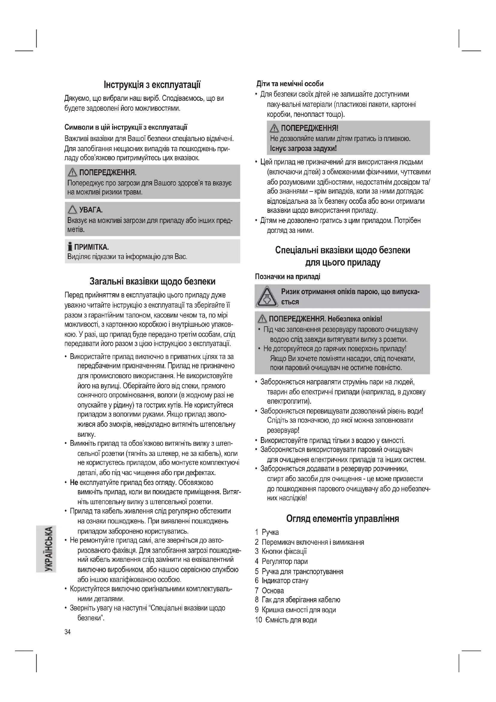 - Дітям не дозволено гратись з цим приладом. Потрібен догляд за ними. Спеціальні вказівки щодо безпеки для цього приладу Позначки на приладі Ризик отримання опіків парою, що випуска-