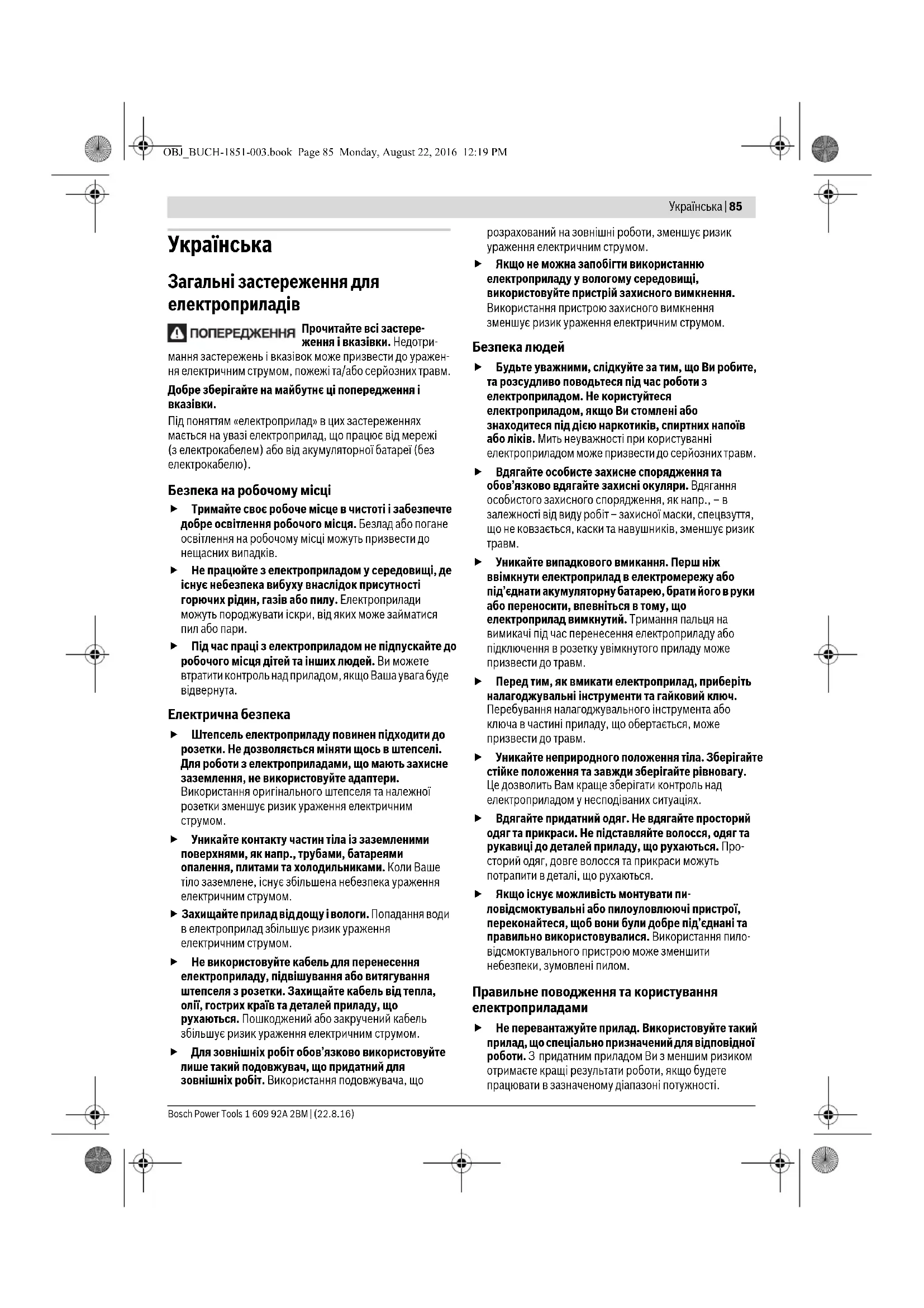 Уникайте випадкового вмикання. Перш ніж ввімкнути електроприлад в електромережу або під’єднати акумуляторну батарею, брати його в руки або переносити, впевніться в тому, що електроприлад вимкнутий. Тримання пальця на вимикачі під час перенесення електроприладу або підключення в розетку увімкнутого приладу може призвести до травм. Перед тим, як вмикати електроприлад, приберіть налагоджувальні інструменти та гайковий ключ. Перебування налагоджувального інструмента або ключа в частині приладу, що обертається, може призвести до травм. Уникайте неприродного положення тіла. Зберігайте стійке положення та завжди зберігайте рівновагу. Це дозволить Вам краще зберігати контроль над електроприладом у несподіваних ситуаціях. Вдягайте придатний одяг. Не вдягайте просторий одяг та прикраси. Не підставляйте волосся, одяг та рукавиці до деталей приладу, що рухаються. Про- сторий одяг, довге волосся та прикраси можуть потрапити в деталі, що рухаються. Якщо існує можливість монтувати пи- ловідсмоктувальні або пилоуловлюючі пристрої, переконайтеся, щоб вони були добре під’єднані та правильно використовувалися. Використання пило- відсмоктувального пристрою може зменшити небезпеки, зумовлені пилом. Правильне поводження та користування електроприладами Не перевантажуйте прилад. Використовуйте такий прилад, що спеціально призначений для відповідної роботи. З придатним приладом Ви з меншим ризиком отримаєте кращі результати роботи, якщо будете працювати в зазначеному діапазоні потужності. OBJ_BUCH-1851-003.book Page 85 Monday, August 22, 2016 12:19 PM86 | Українська 1 609 92A 2BM | (22.8.16) Bosch Power Tools Не користуйтеся електроприладом з пошкодженим вимикачем. Електроприлад, який не можна увімкнути або вимкнути, є небезпечним і його треба відремонтувати. Перед тим, як регулювати що-небудь на приладі, міняти приладдя або ховати прилад, витягніть штепсель із розетки та/або витягніть акумуляторну батарею. Ці попереджувальні заходи з техніки безпеки зменшують ризик випадкового запуску приладу. Ховайте електроприлади, якими Ви саме не користуєтесь, від дітей. Не дозволяйте користуватися електроприладом особам, що не знайомі з його роботою або не читали ці вказівки. У разі застосування недосвідченими особами прилади несуть в собі небезпеку. Старанно доглядайте за електроприладом. Перевіряйте, щоб рухомі деталі приладу бездоганно працювали та не заїдали, не були пошкодженими або настільки пошкодженими, щоб це могло вплинути на функціонування електроприладу. Пошкоджені деталі треба відремонтувати, перш ніж користуватися ними знов. Велика кількість нещасних випадків спричиняється поганим доглядом за електроприладами. Тримайте різальні інструменти нагостреними та в чистоті. Старанно доглянуті різальні інструменти з гострим різальним краєм менше застряють та легші в експлуатації. Використовуйте електроприлад, приладдя до нього, робочі інструменти т.і. відповідно до цих вказівок. Беріть до уваги при цьому умови роботи та спе- цифіку виконуваної роботи. Використання електроприладів для робіт, для яких вони не передбачені, може призвести до небезпечних ситуацій.