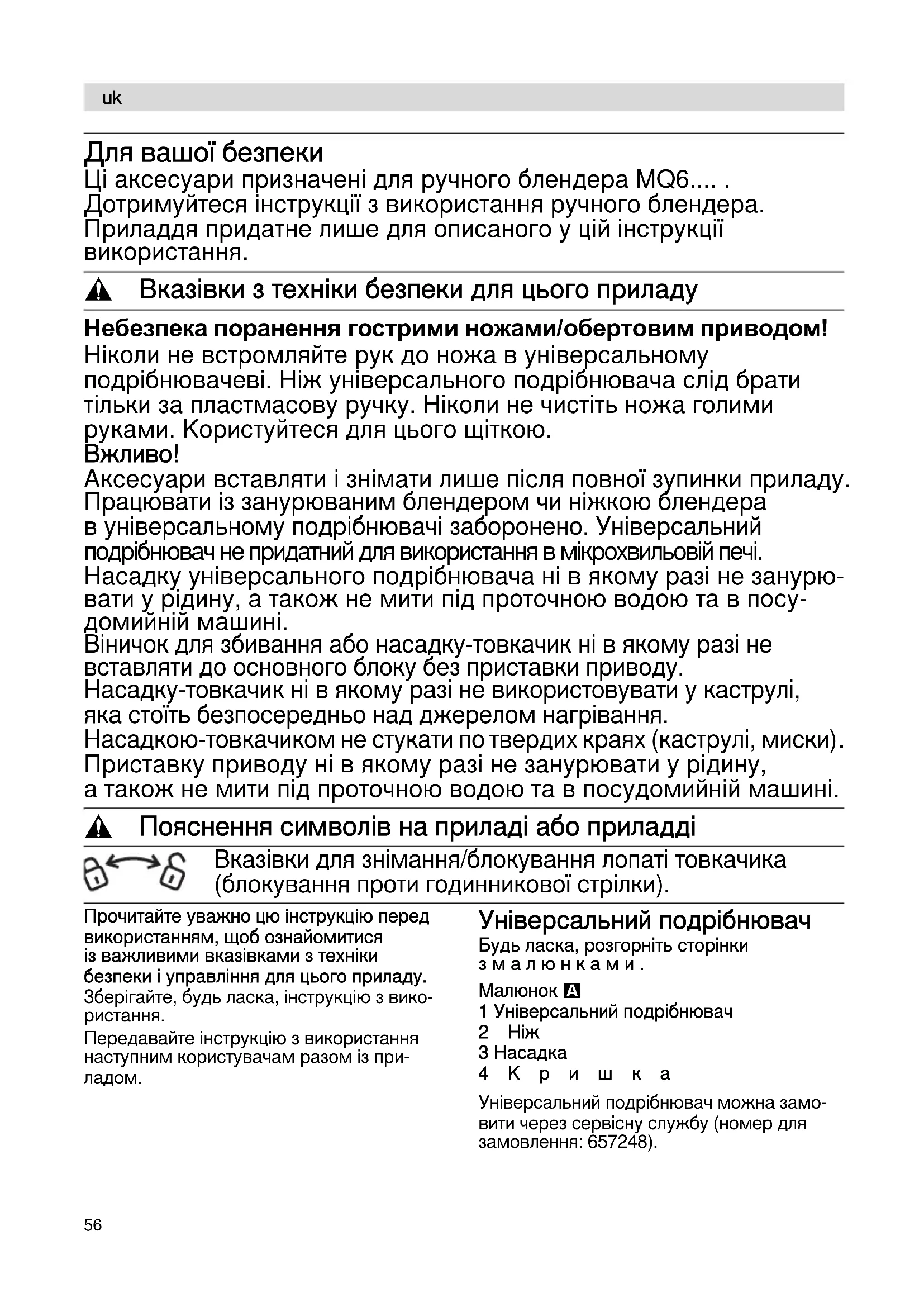 A módosítás jogát fenntartjuk.56 Для вашої безпеки Ці аксесуари призначені для ручного блендера MQ6.... . Дотримуйтеся інструкції з використання ручного блендера. Приладдя придатне лише для описаного у цій інструкції використання. , Вказівки з техніки безпеки для цього приладу Hебезпека поранення гострими ножами/обертовим приводом! Ніколи не встромляйте рук до ножа в універсальному подрібнювачеві. Ніж універсального подрібнювача слід брати тільки за пластмасову ручку. Ніколи не чистіть ножа голими руками. Kористуйтеся для цього щіткою.
