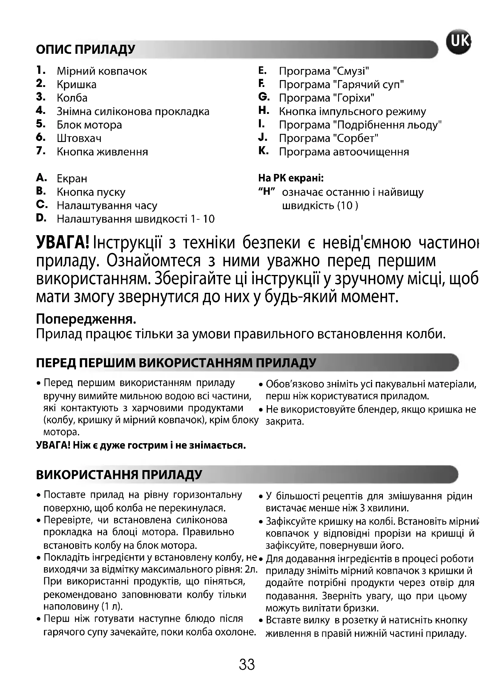 - Перед першим використанням приладувручну вимийте мильною водою всі частини,які контактують з харчовими продуктами(колбу, кришку й мірний ковпачок), крім блокумотора.УВАГА! Ніж є дуже гострим і не знімається.• Обов’язково зніміть усі пакувальні матеріали,перш ніж користуватися приладом.• Не використовуйте блендер, якщо кришка незакрита. УВАГА! Інструкції з техніки безпеки є невід'ємною частиною приладу. Ознайомтеся з ними уважно перед першим використанням. Зберігайте ці інструкції у зручному місці, щоб мати змогу звернутися до них у будь-який момент. Попередження. Прилад працює тільки за умови правильного встановлення колби. ВИКОРИСТАННЯ ПРИЛАДУ